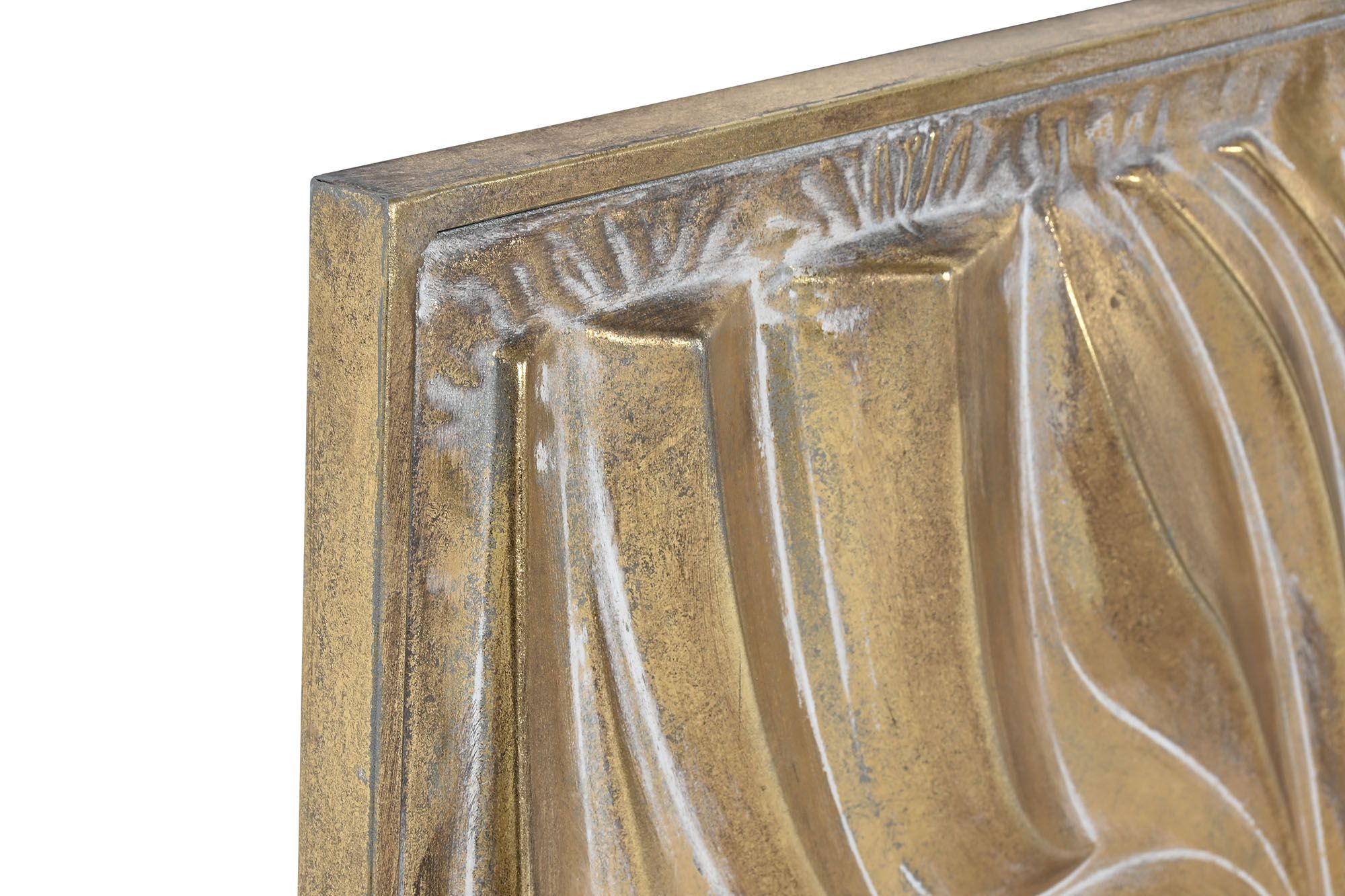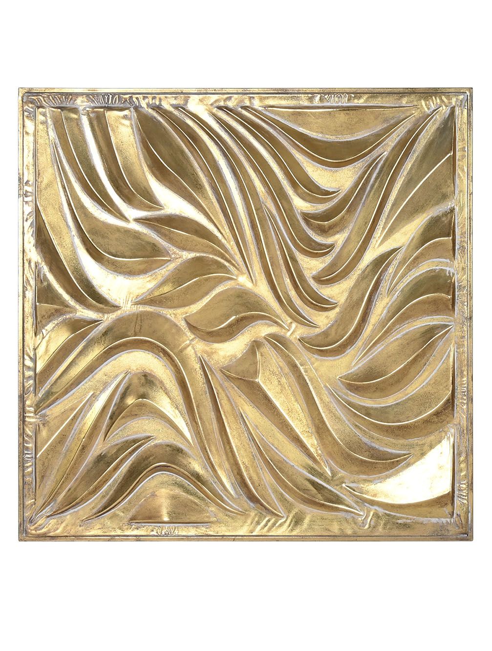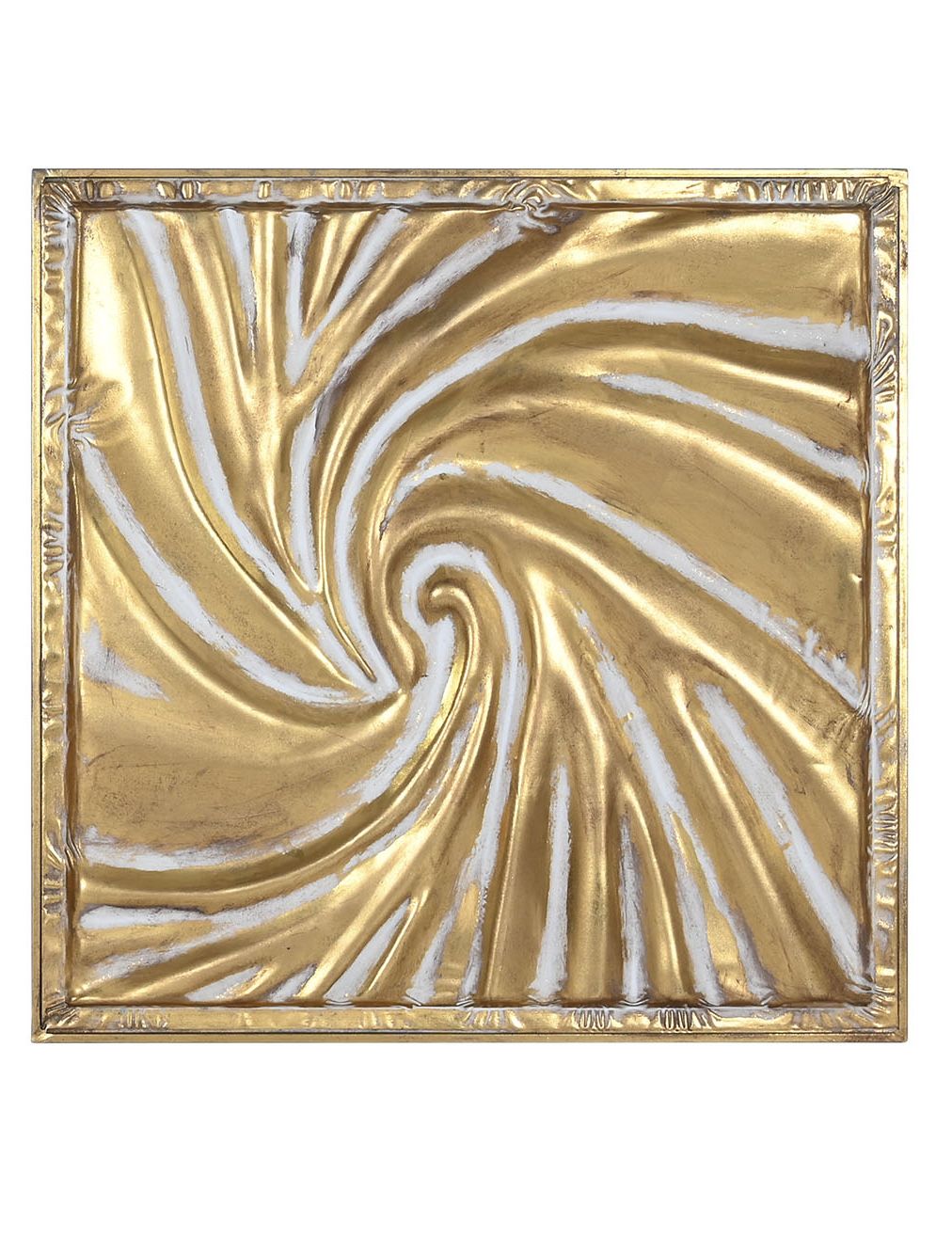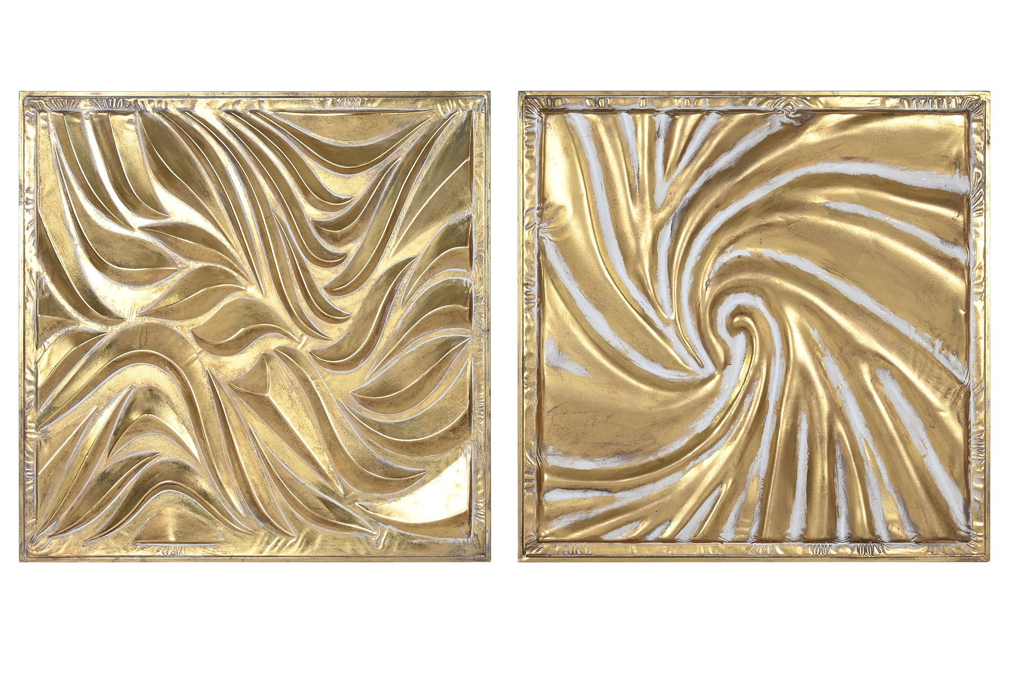 Dos paneles metálicos con diseños en relieve: uno con formas orgánicas fluidas y otro con un espiral central que irradia movimiento. Su acabado dorado aporta lujo y dinamismo a cualquier pared.