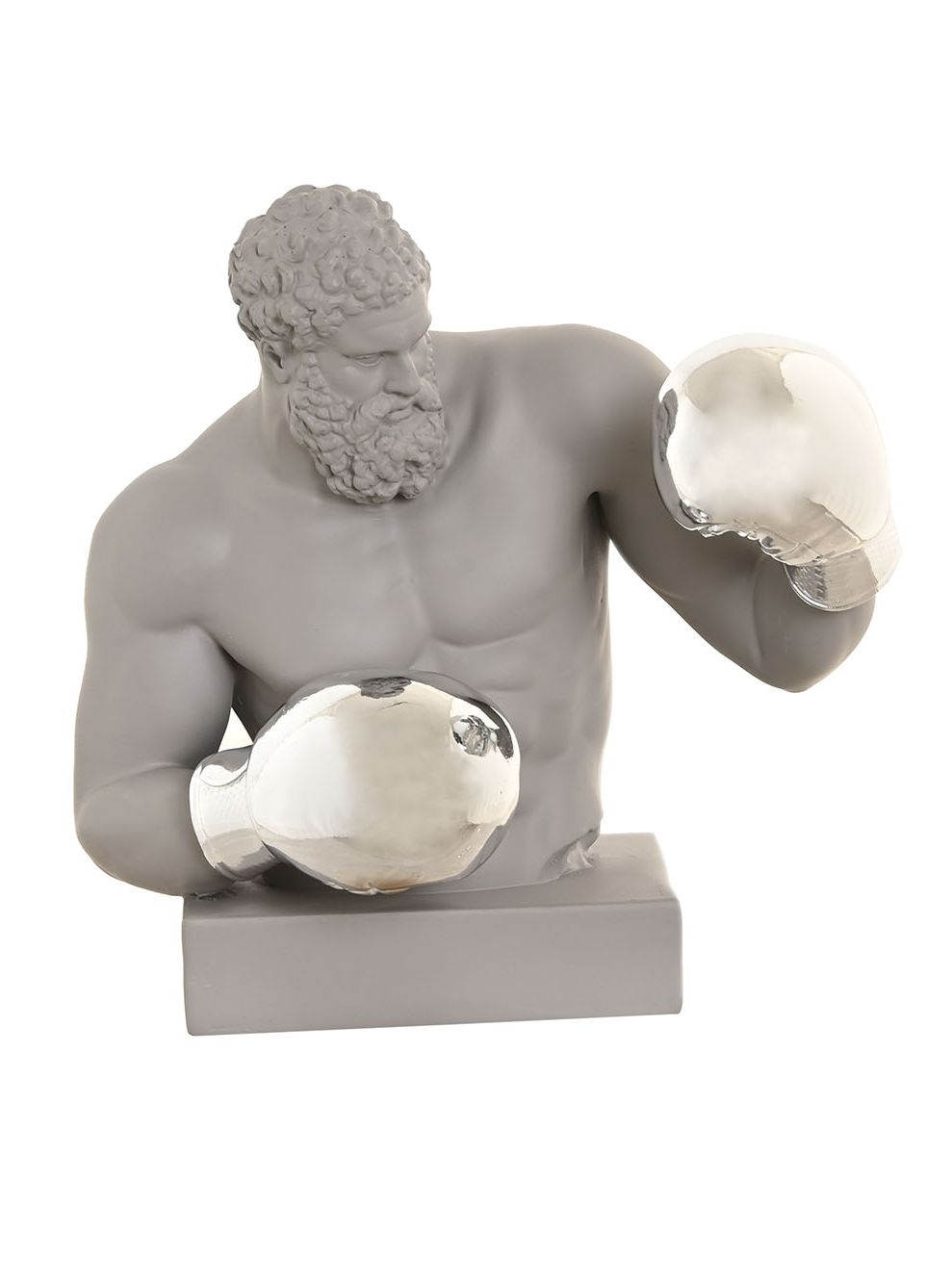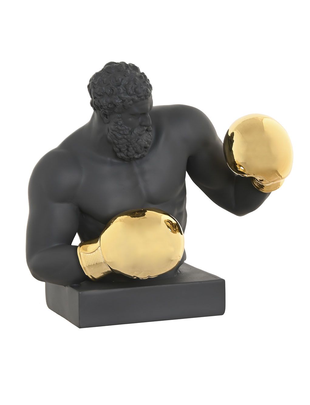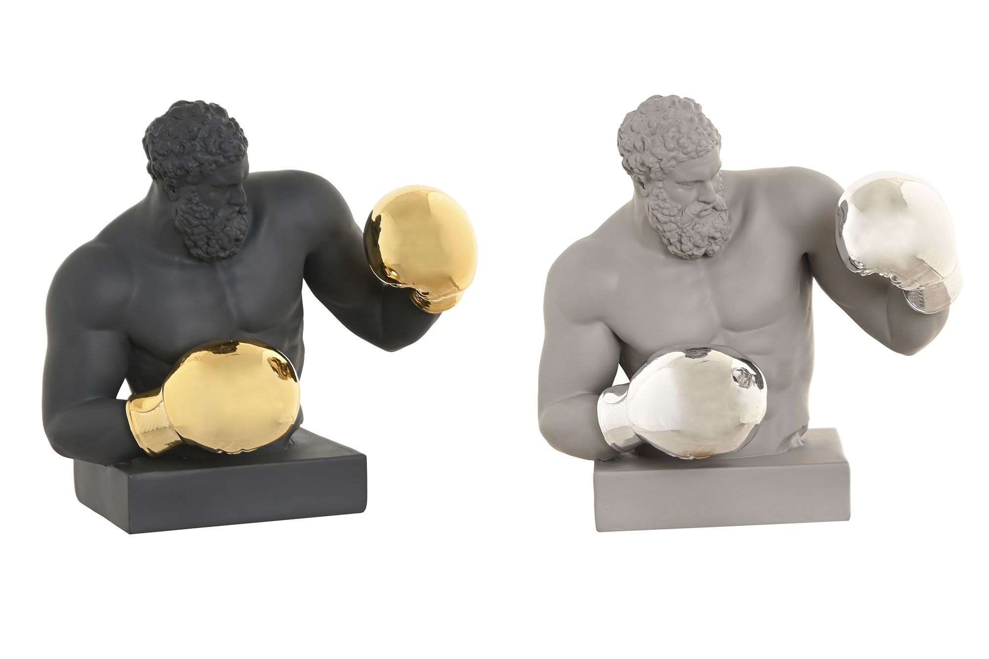 Dos bustos modernos de boxeadores en acabado mate, uno con guantes dorados y otro con guantes plateados. Una pieza decorativa que transmite fuerza y estilo contemporáneo.