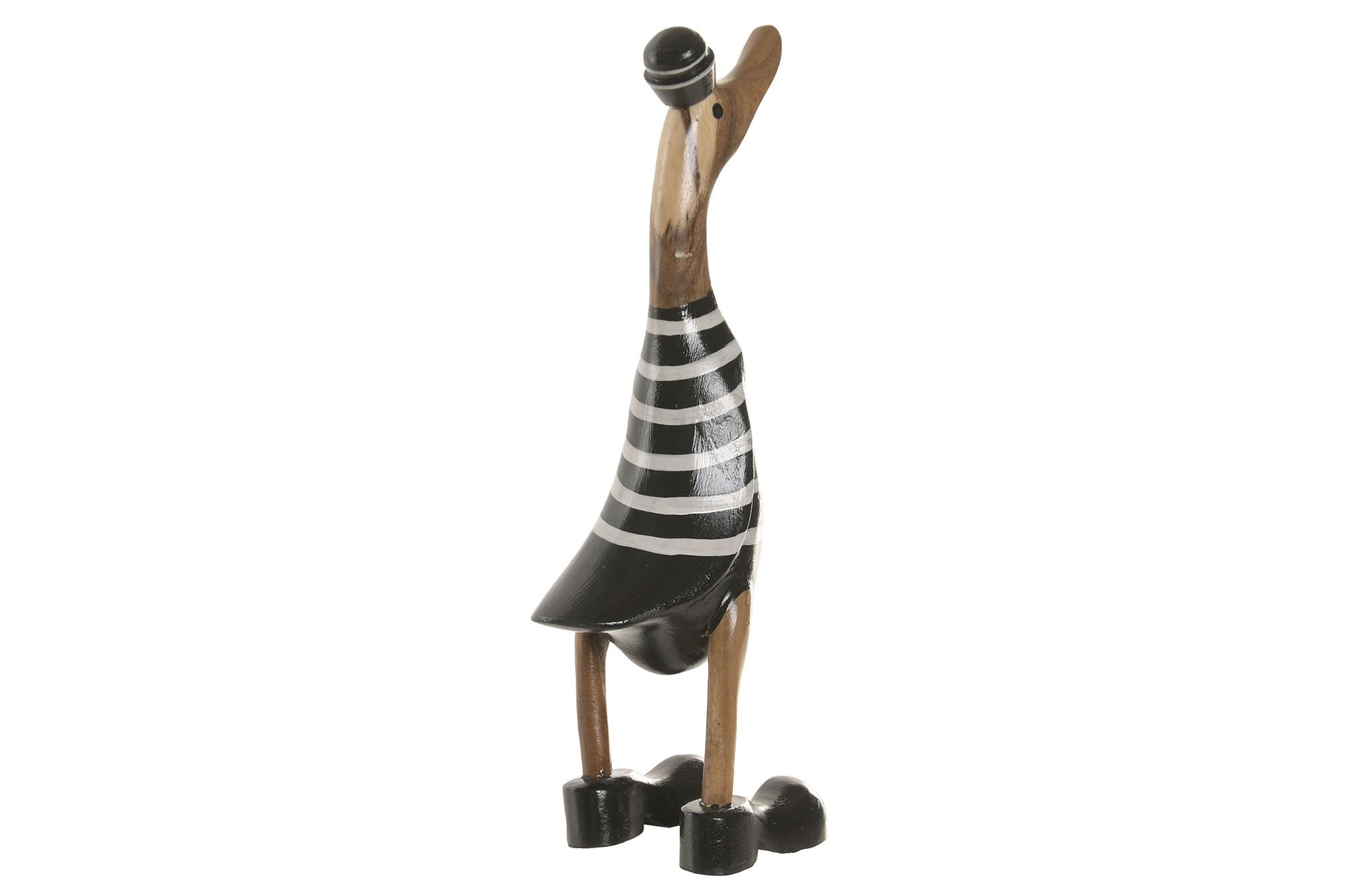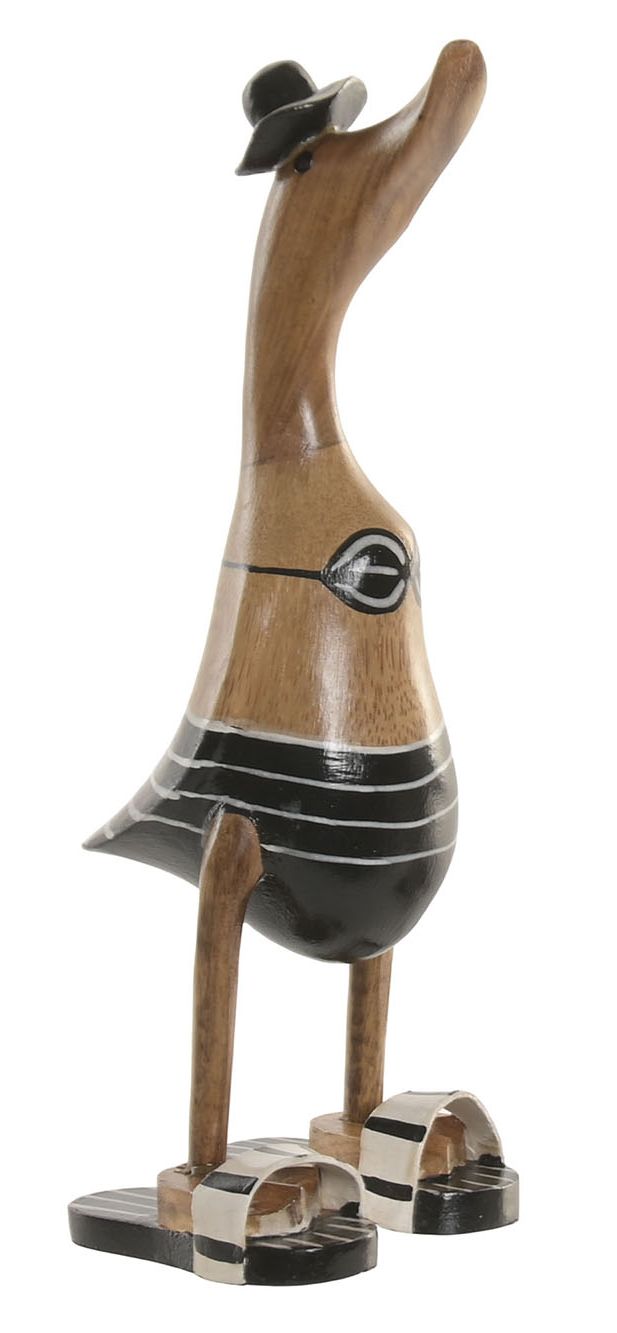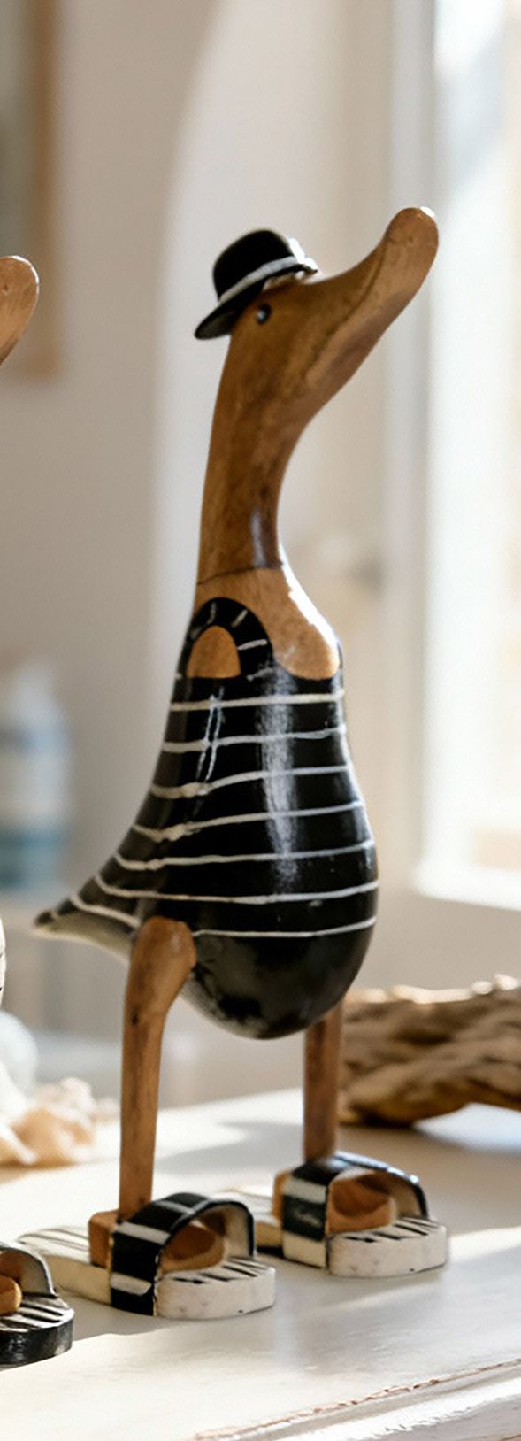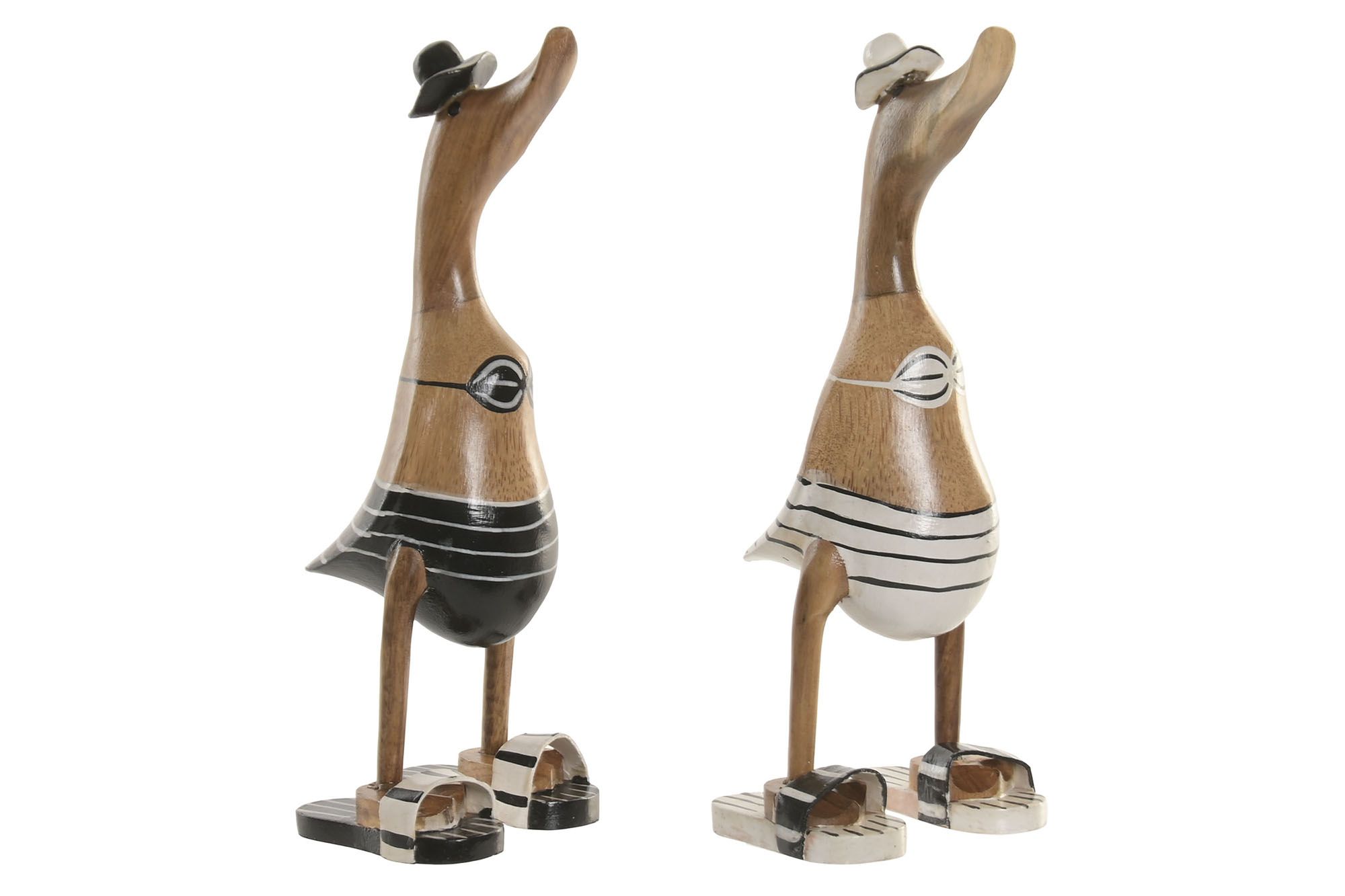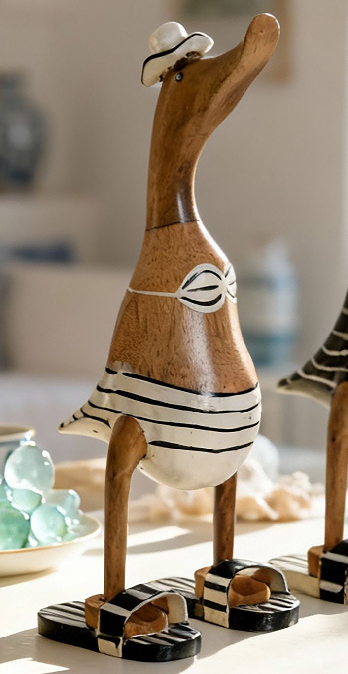 Figuras de patos vestidos con trajes veraniegos a rayas, ideales para aportar un toque divertido y costero a la decoración.