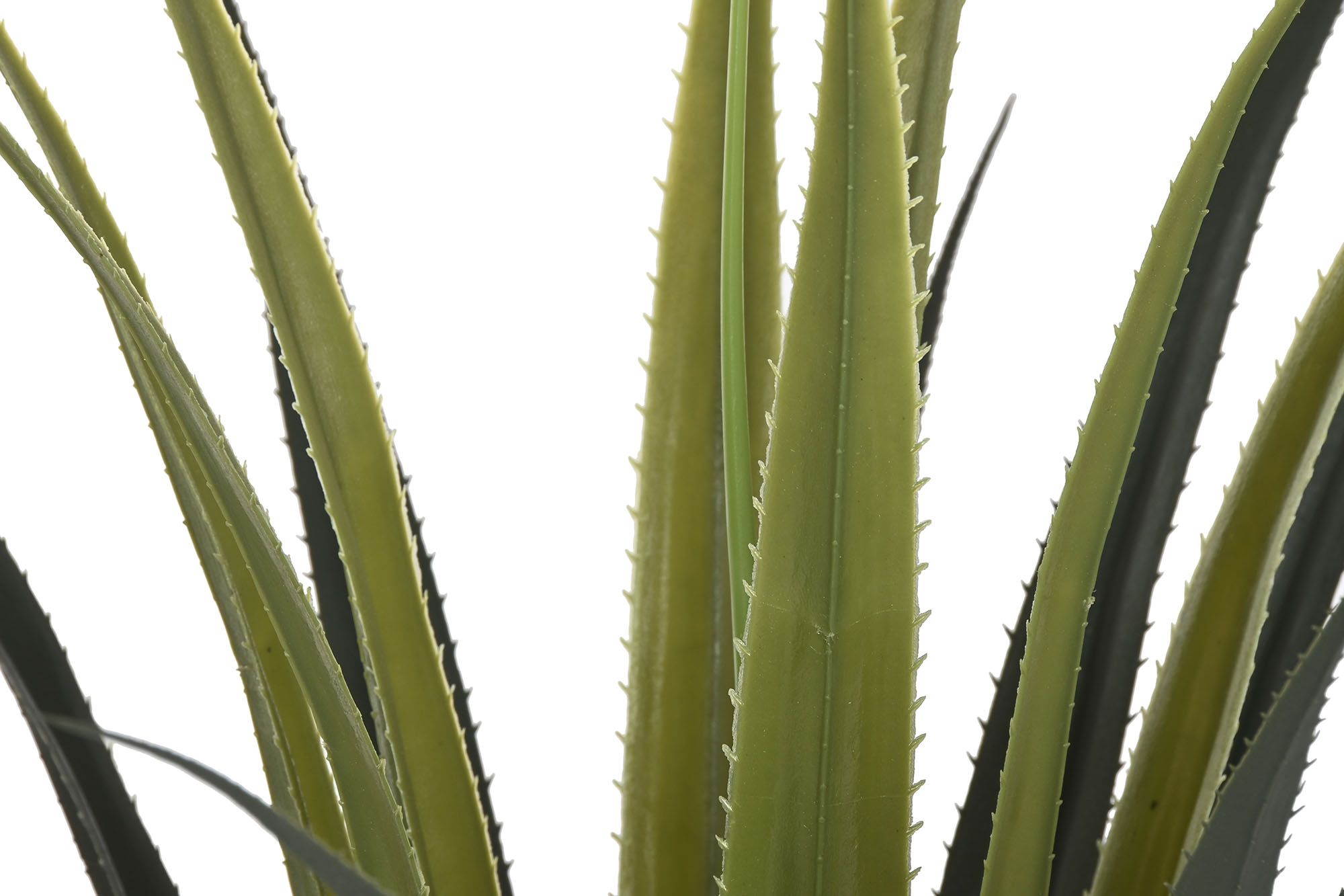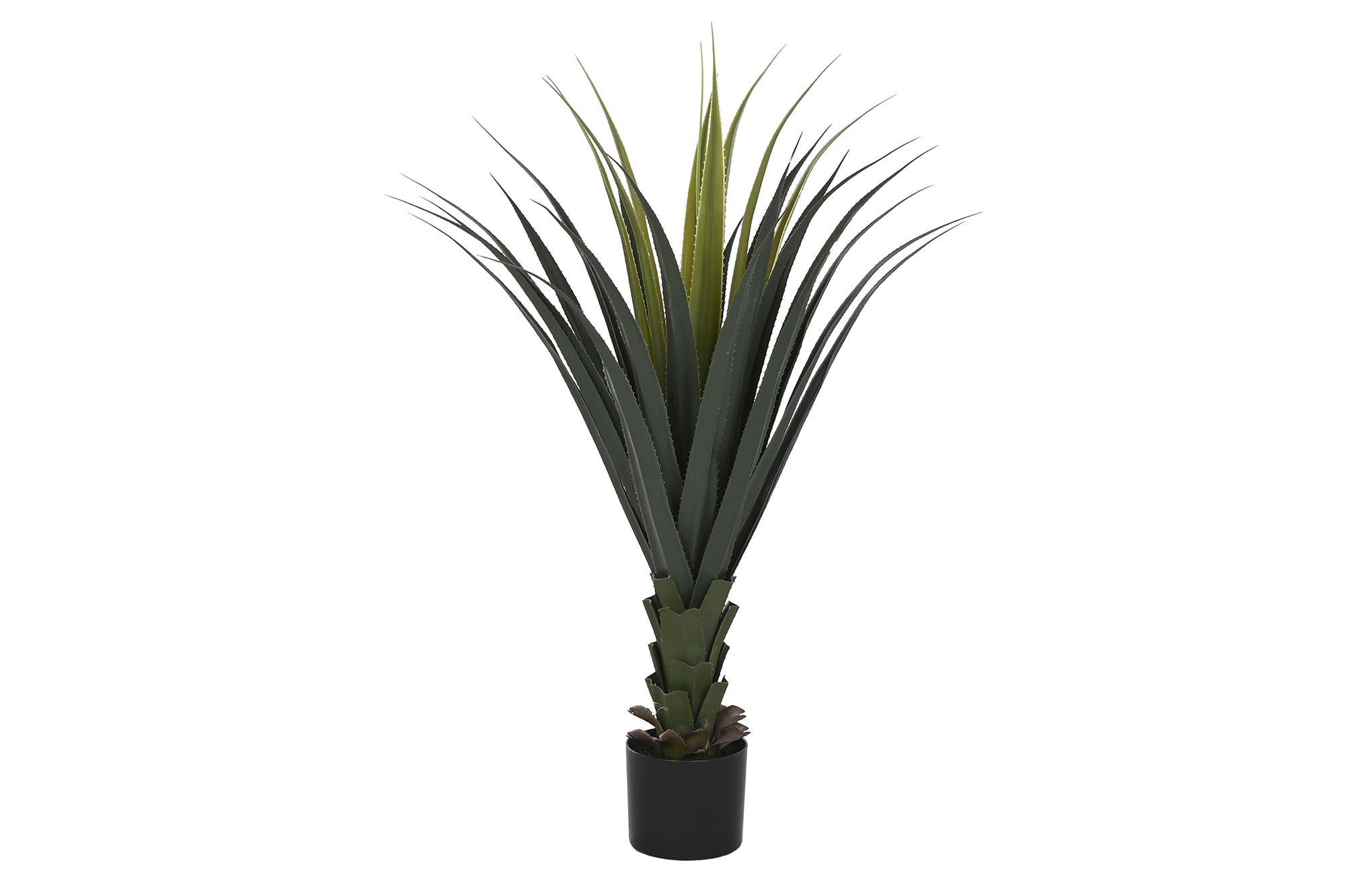Planta artificial de hojas rígidas y verdes en maceta negra minimalista, perfecta para añadir frescura sin mantenimiento.