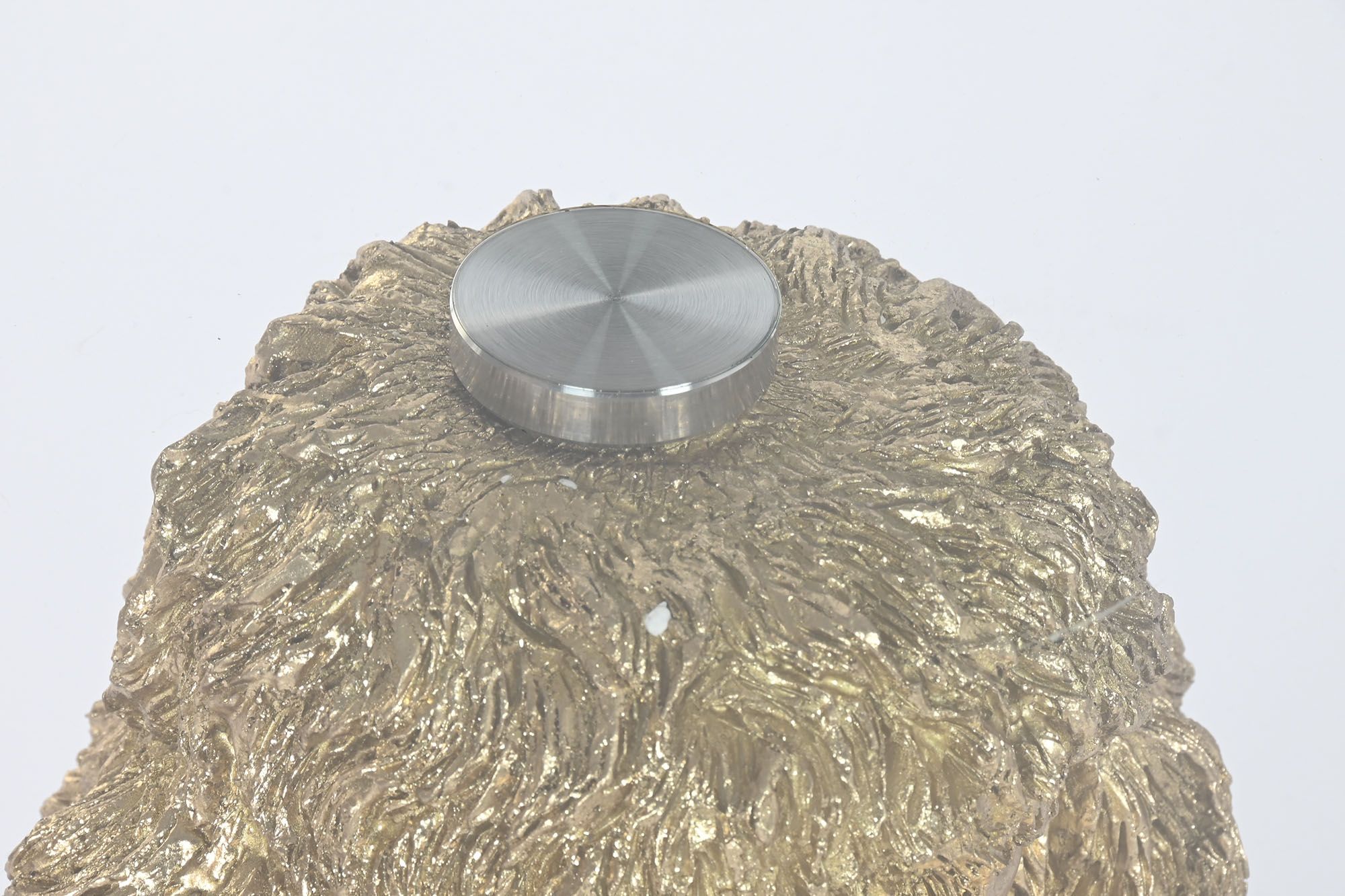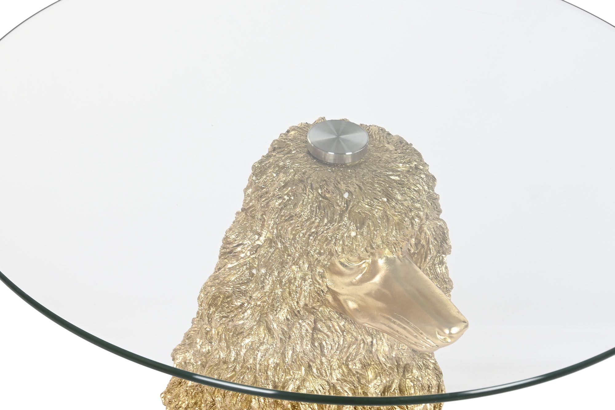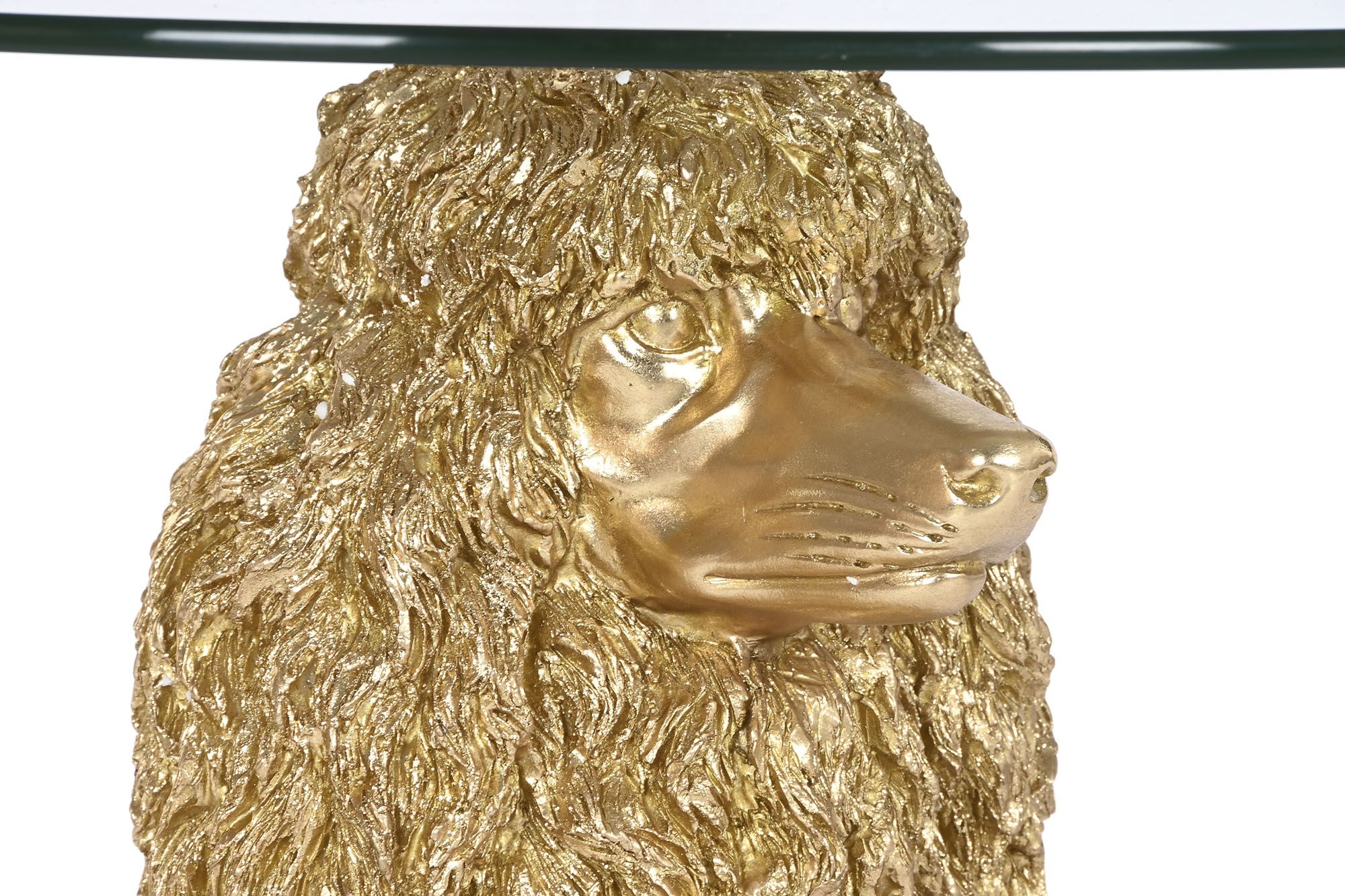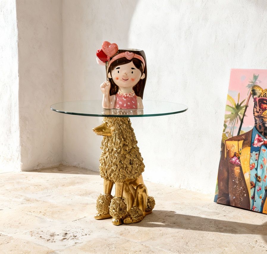 Mesa auxiliar con base de poodle dorado y tapa de cristal, una pieza divertida y elegante que destaca en cualquier ambiente.