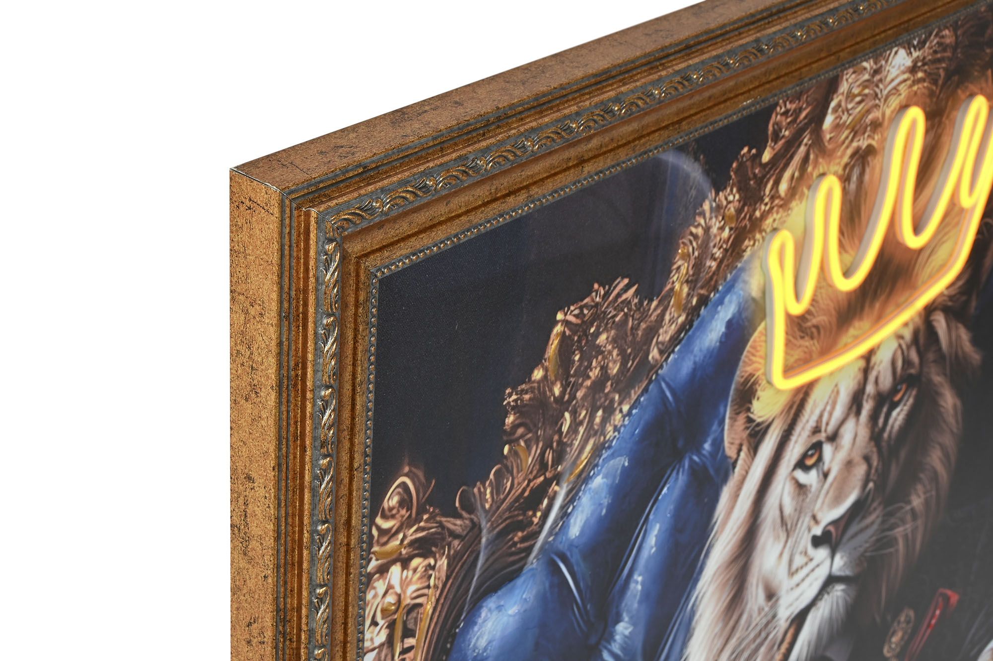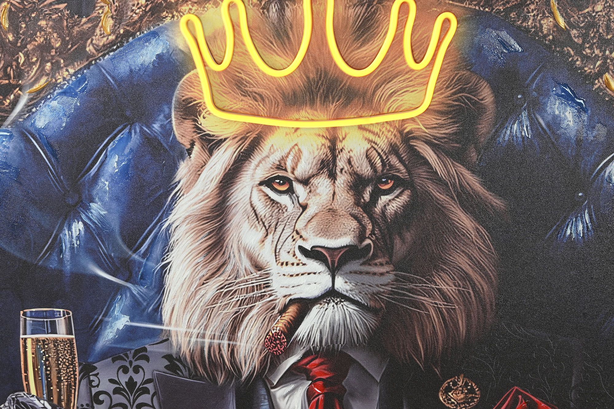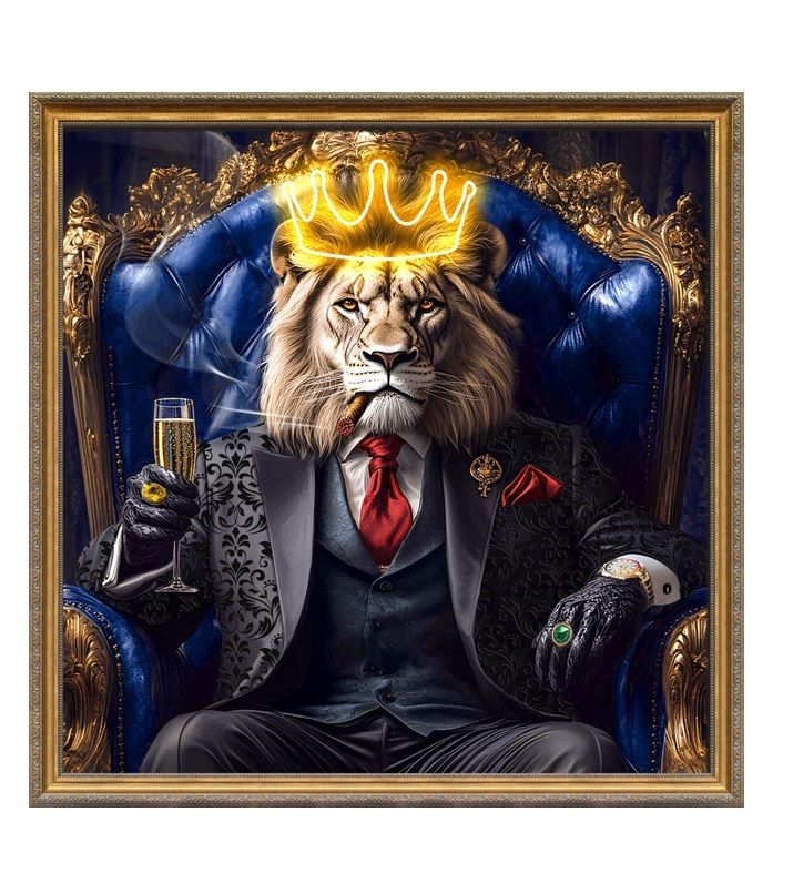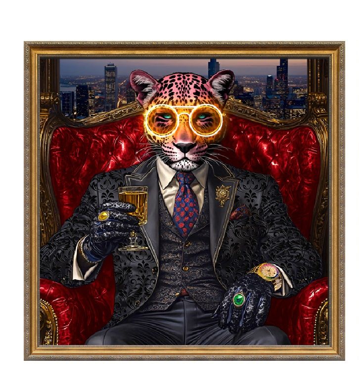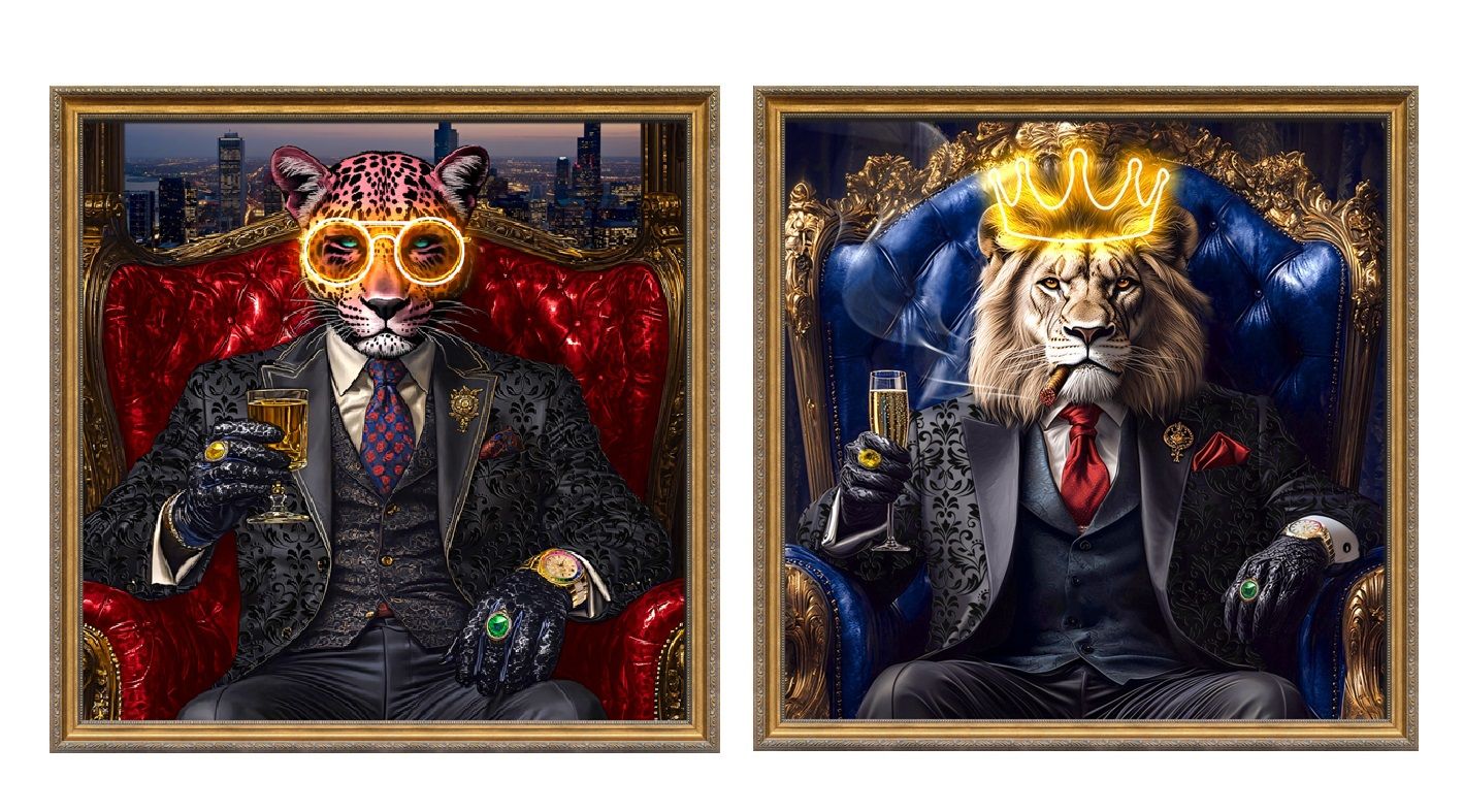 Dos animales antropomorfos —un leopardo rosado y un león coronado— posan en sillones ornamentados, vestidos con trajes oscuros y accesorios lujosos mientras sostienen copas de champán. La escena mezcla opulencia, autoridad y un estilo moderno con tintes surrealistas.