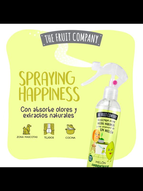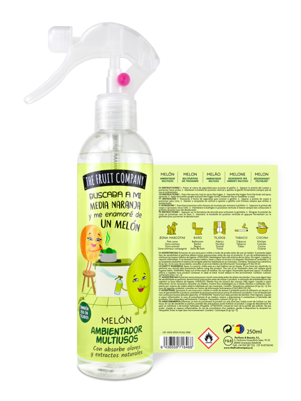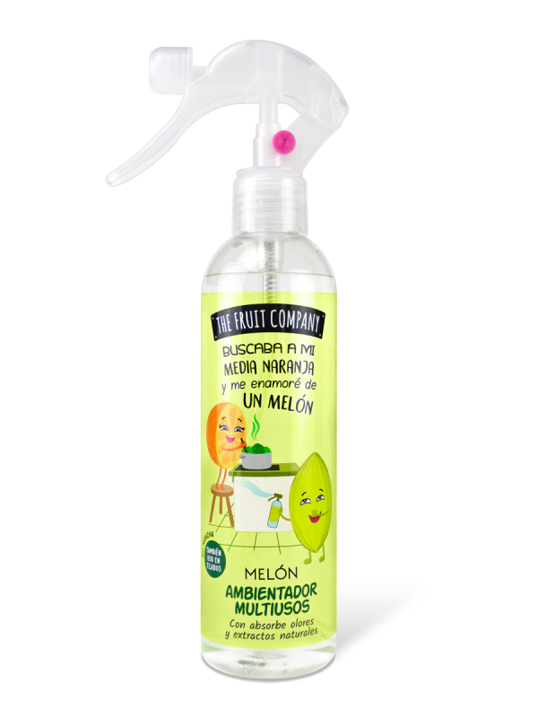 Spary Ambientador de 250 ml con cítrico y frutal aroma a Melón y formulado con extractos naturales. Apto para tejidos, absorbe olores y.... ¡No mancha!