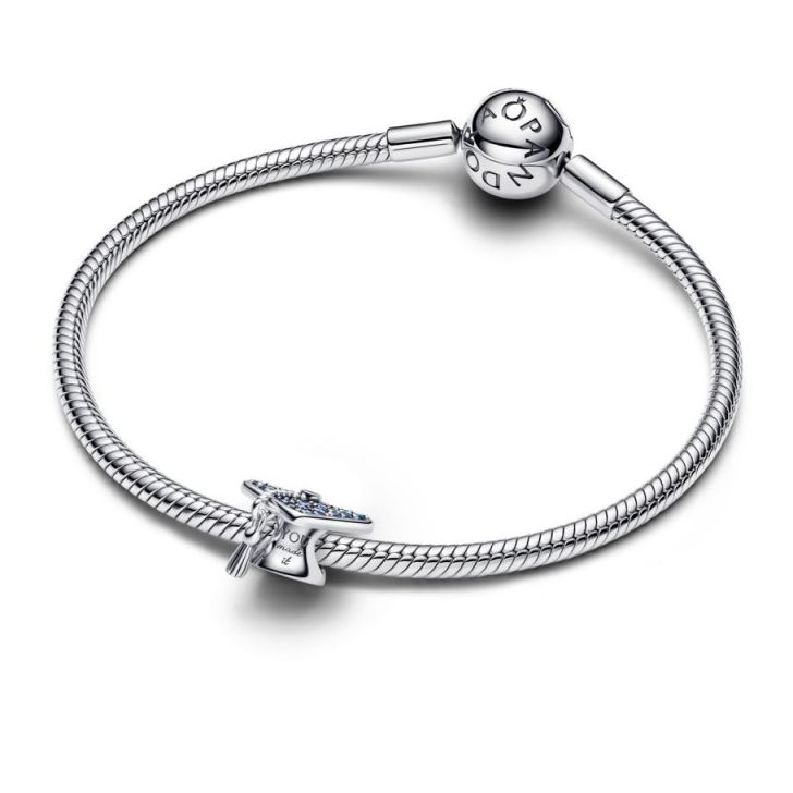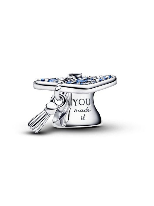 Charm Colgante Pandora Birrete Graduación 2026, fabricado en plata de ley con cristales brillantes azules.