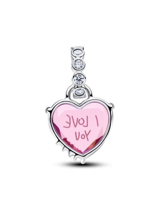 Charm Colgante Pandora Corazón de la colección Día de la Madre 2026 fabricado en plata de ley en forma de corazón con cristal rosa y los grabados "I LOVE YOU" y "MOM".
