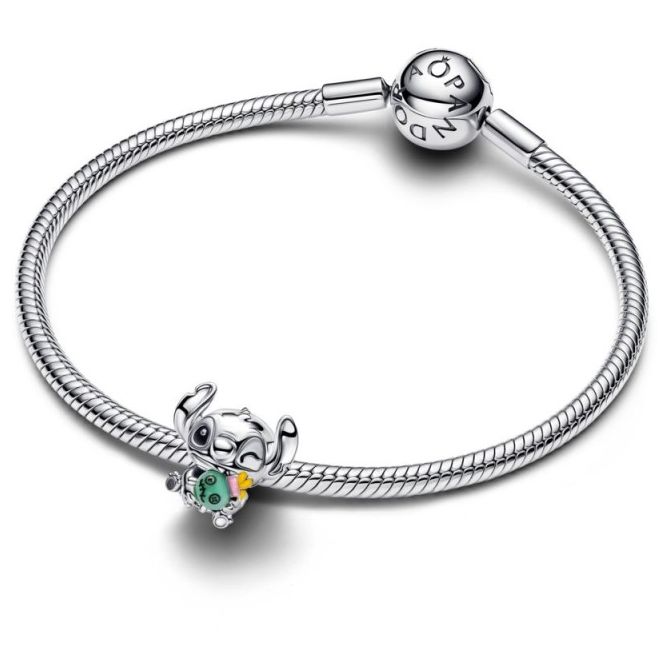 Charm Pandora Stitch y Scrump de la colección Pandora x Disney, fabricado en plata y con acabados en cristal murano verde.