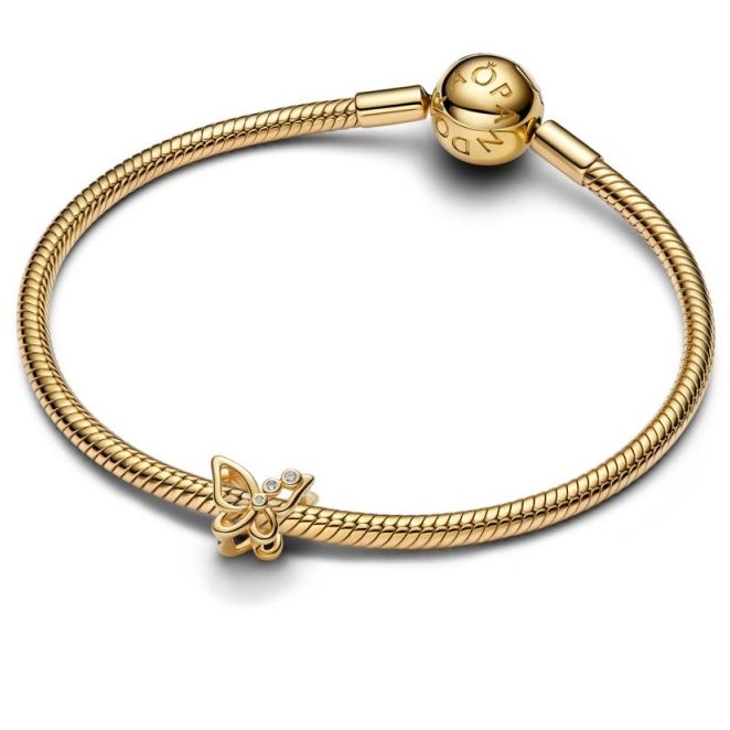 Charm Pandora Mariposa Calada de la colección "Día de la Madre 2026", fabricado con una aleación de metales bañados en oro de 14kt en forma de mariposa calada con 3 preciosas circonitas transparentes.