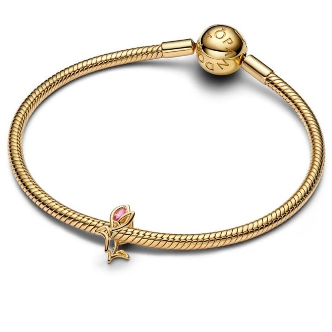Charm Pandora Tulipán Calado de la colección "Día de la Madre 2026", fabricado con una aleación de metales bañados en oro amarillo, en forma de tulipán y con una circonita rosa.