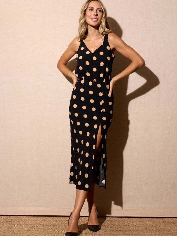Falda midi de lunares marrones con abertura delantera en la parte izquierda y goma en la cintura.