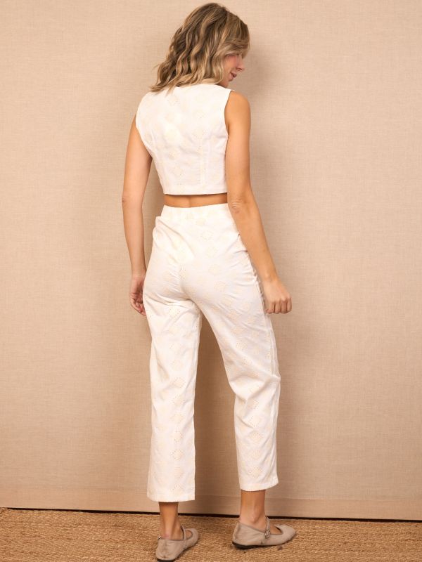 Conjunto de chaleco crop con pantalón de pinzas estilo capri. Las dos piezas van bordadas con ganchillo beige y completamente forradas.