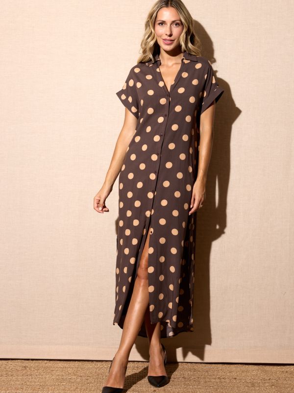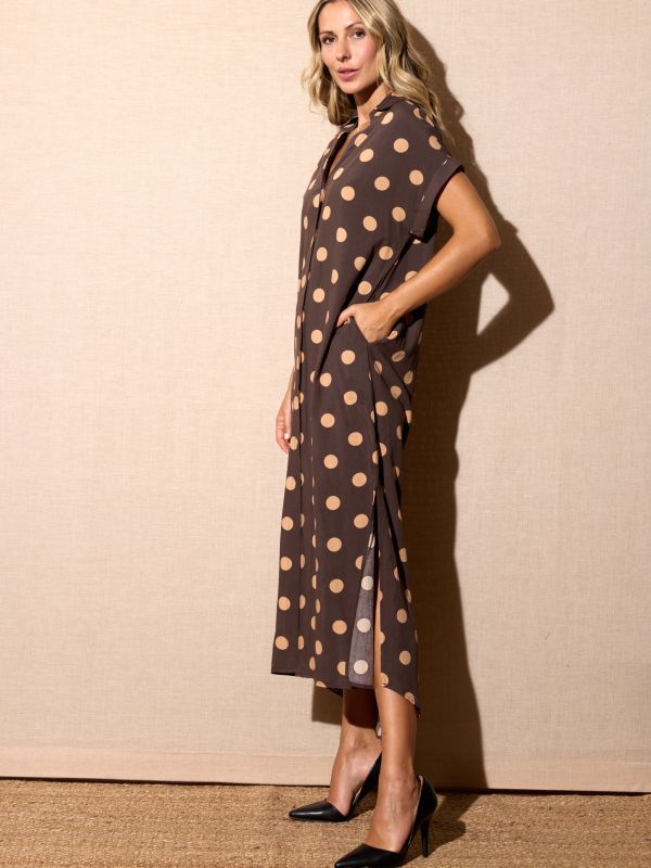 Vestido camisero en marrón oscuro con lunares marrón claro. Cuello camisero con escote pico, manga corta doblada con bolsillos y aberturas laterales. Sin forro.