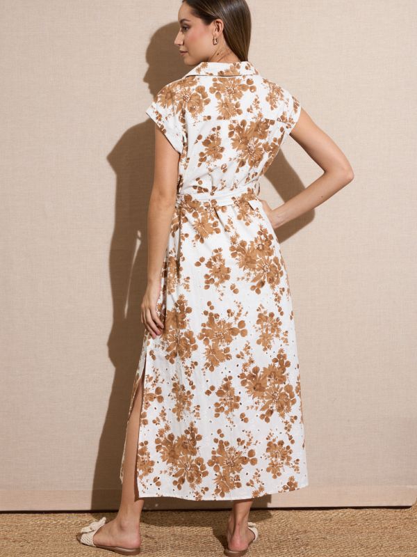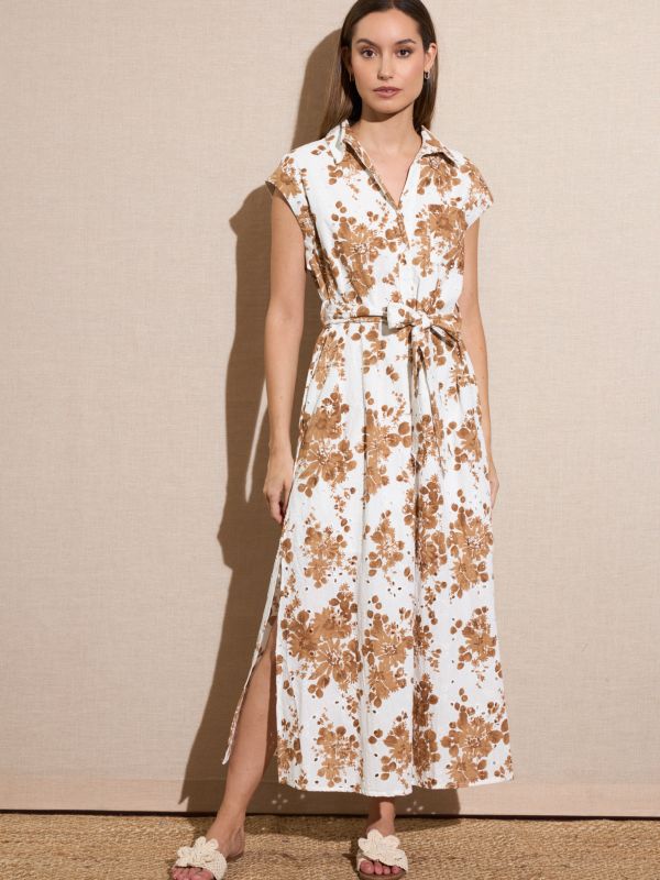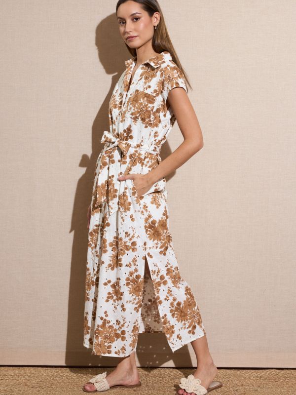 Vestido largo blanco bordado con estampado de flores en marrón, escote camisero con botones hasta el pecho con bolsillos y aberturas laterales y cinturón en la misma tela. Vestido forrado.