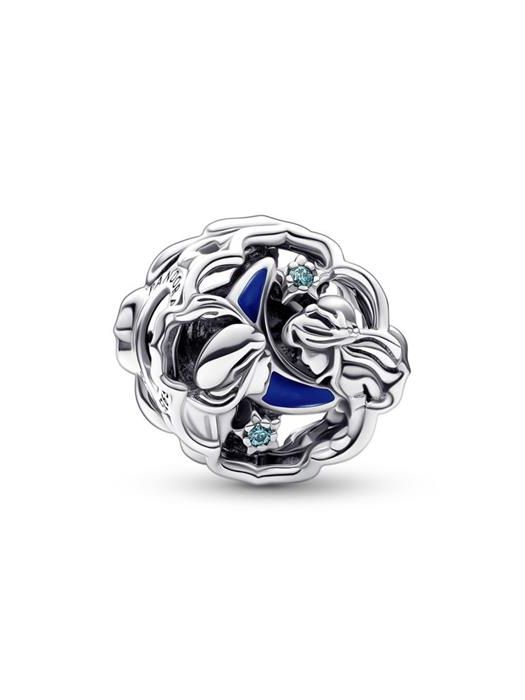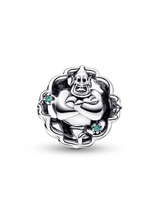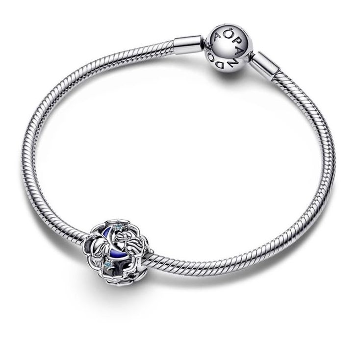 Charm Pandora Aladdín, Princesa Jasmine y Genio, de la colección Disney x Pandora. Fabricado en plata de primera ley en esmalte azul. Este charm tiene la particularidad qe que el Genio brilla en la oscuridad. Con referencia 792349C01.