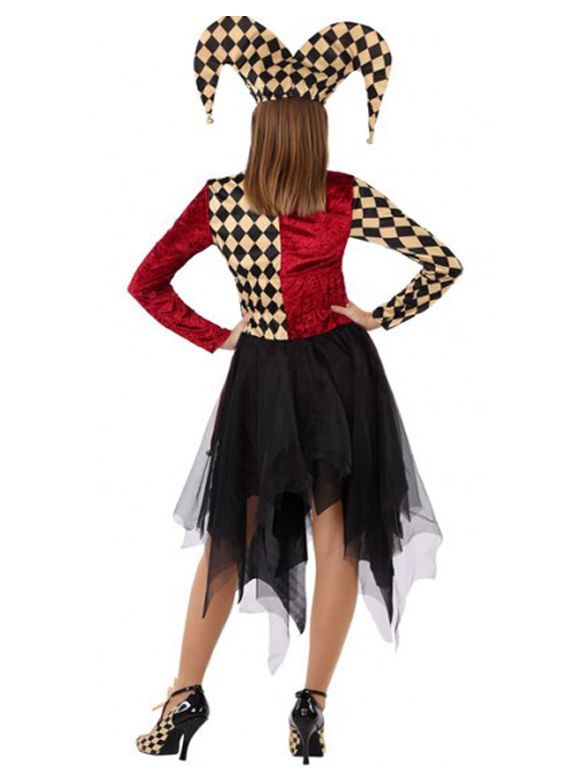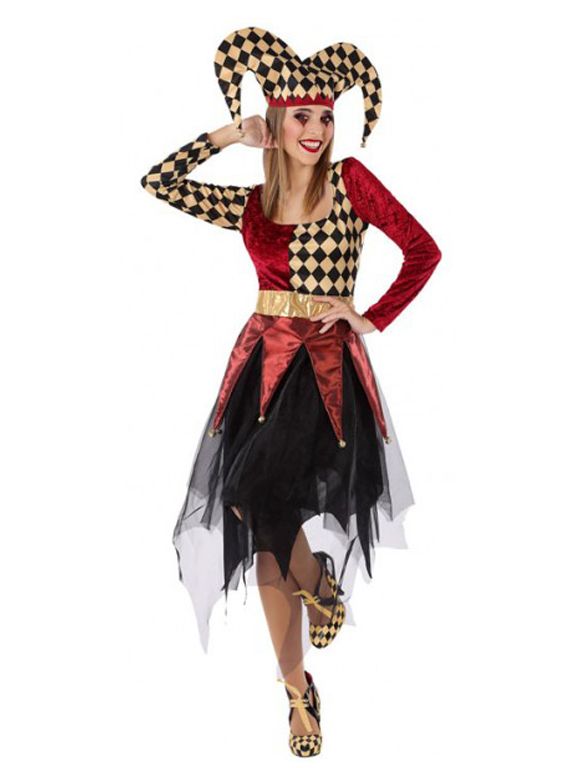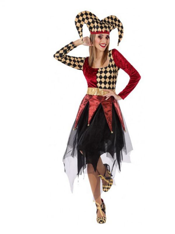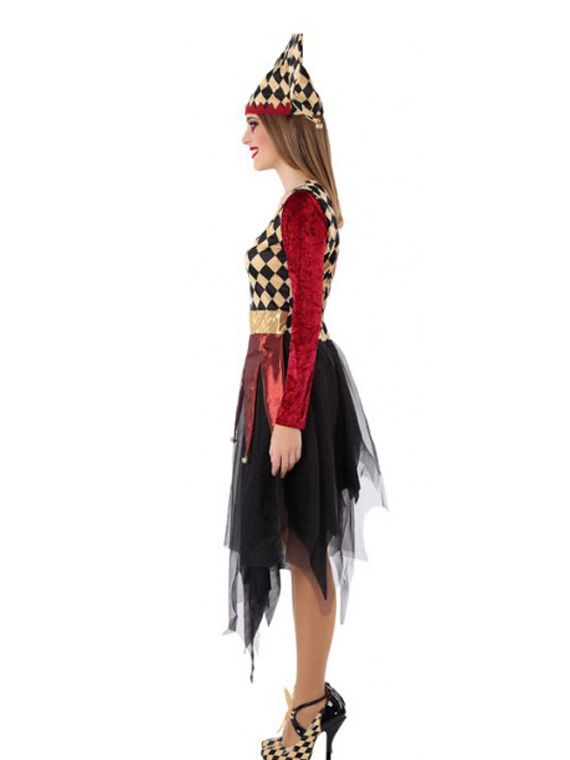 El disfraz de arlquina roja contiene vestido y gorro. Un disfraz ideal para disfrazarse en grupo.