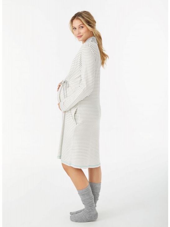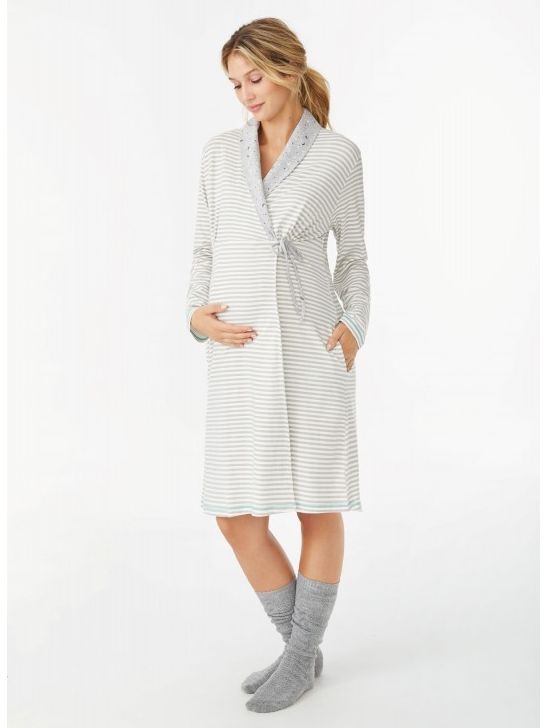 Bata maternal de manga larga en modal-algodón. Estampado derayas con solapa con estampado fantasía de estrellas. Bolsillos laterales.
