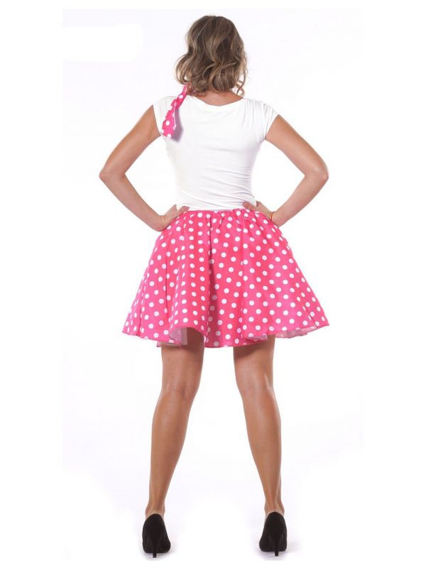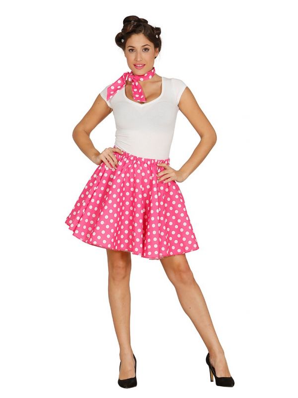 el disfraz de pin-up rosa contiene falda y pañuelo que puedes usar para el cuello o la cabeza