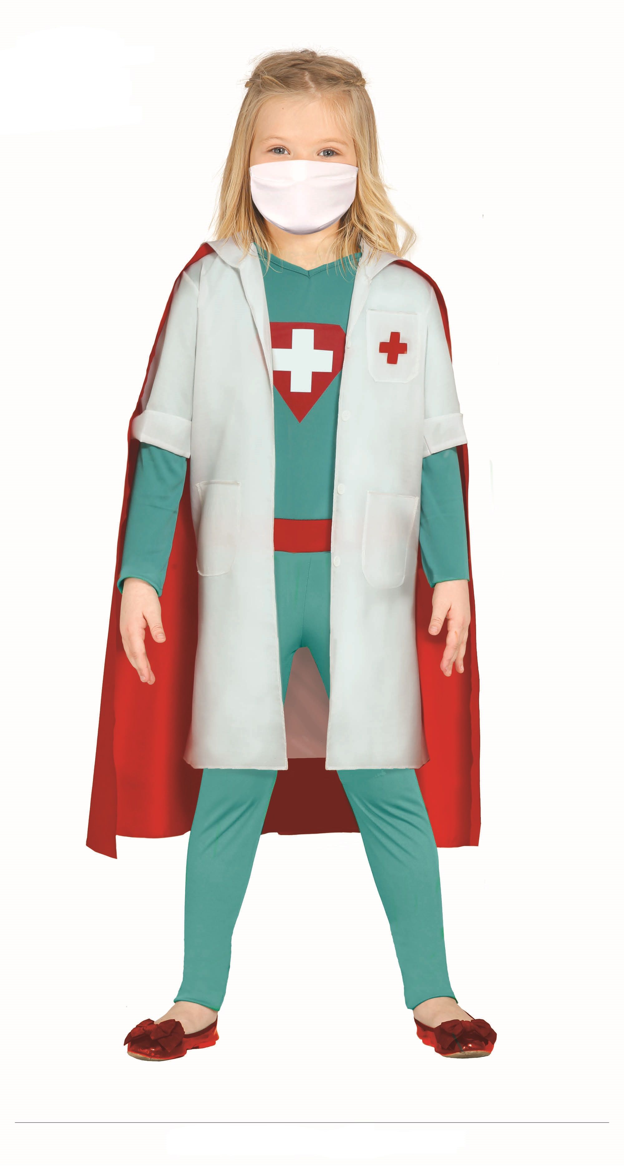 El disfraz de Super médica contiene marcarilla, mono, bata y capa.