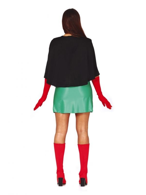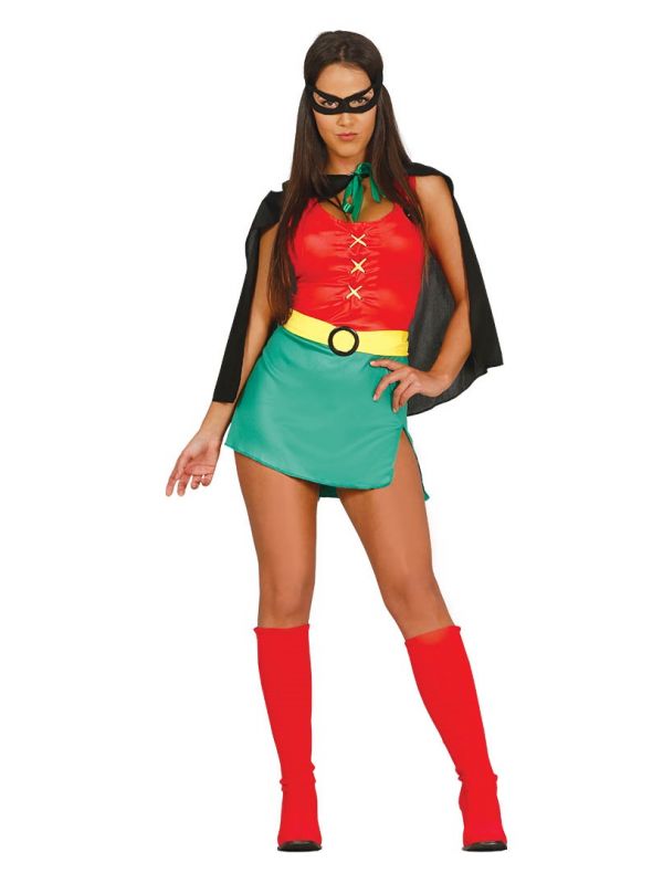 El disfraz de robin chica contiene vestido, cinturón, capa y antifaz.