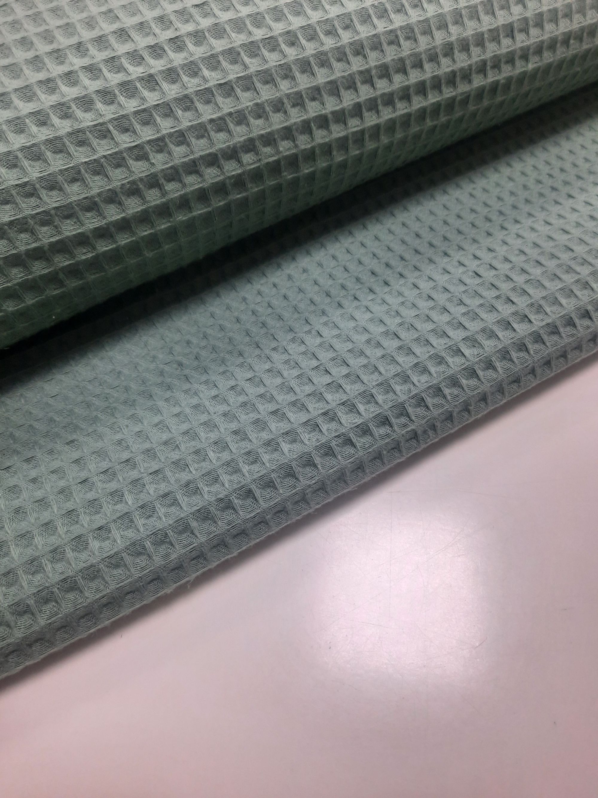 Waffle o gofre, es un tejido llamado así por sus cuadraditos en relieve haciendo forma de nido de abaja,es esponjosa con un tacto suave, manejable y cómoda muy útil para hacer prendas de bebé, sacos,arruyos etc.
