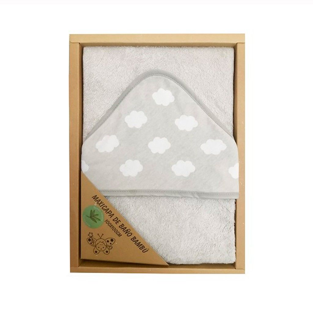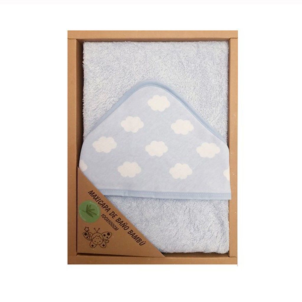 Capa de baño de rizo de 100 x100 cm con fondo en color liso y capucha con estampado de nubes.