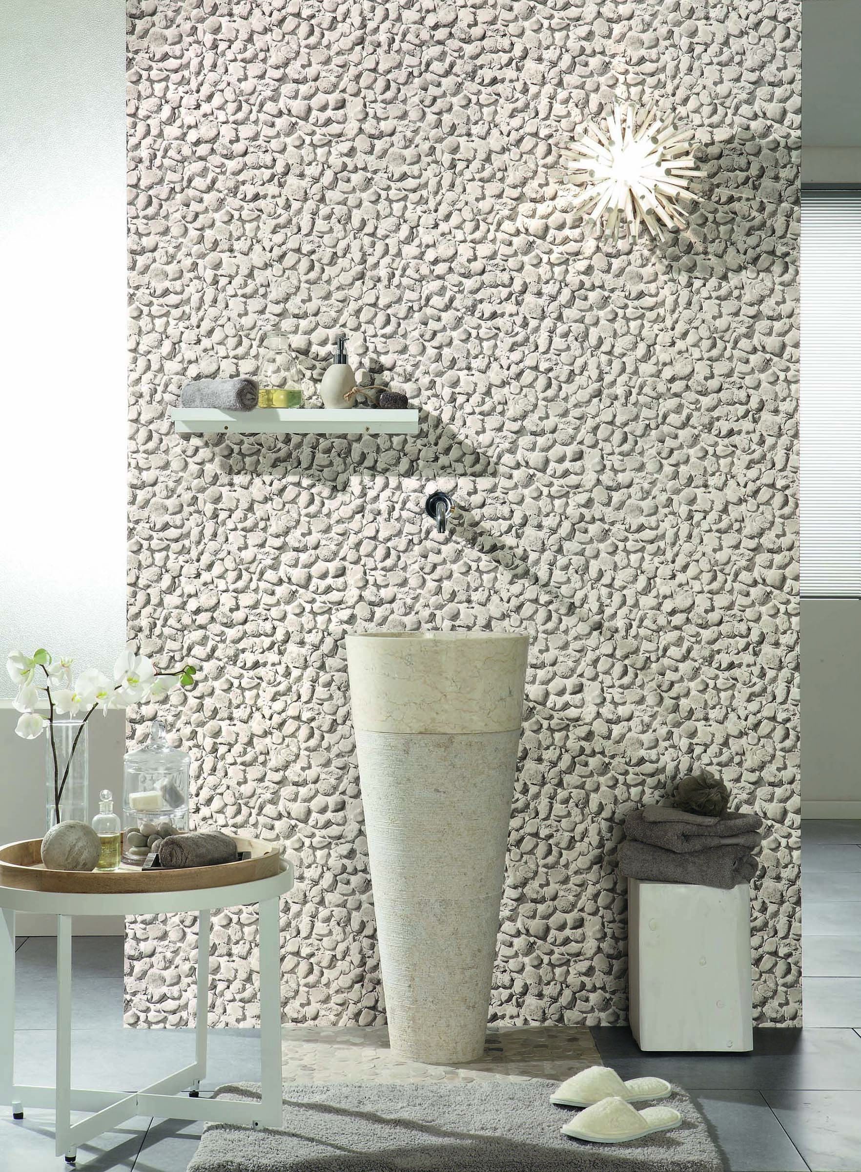 Crea un ambiente rústico y muy actual con este diseño que simula muro de piedra con efecto tridimensional que puede ser colocado en baños en zonas no directa con el agua, dado su acabado vinílico.