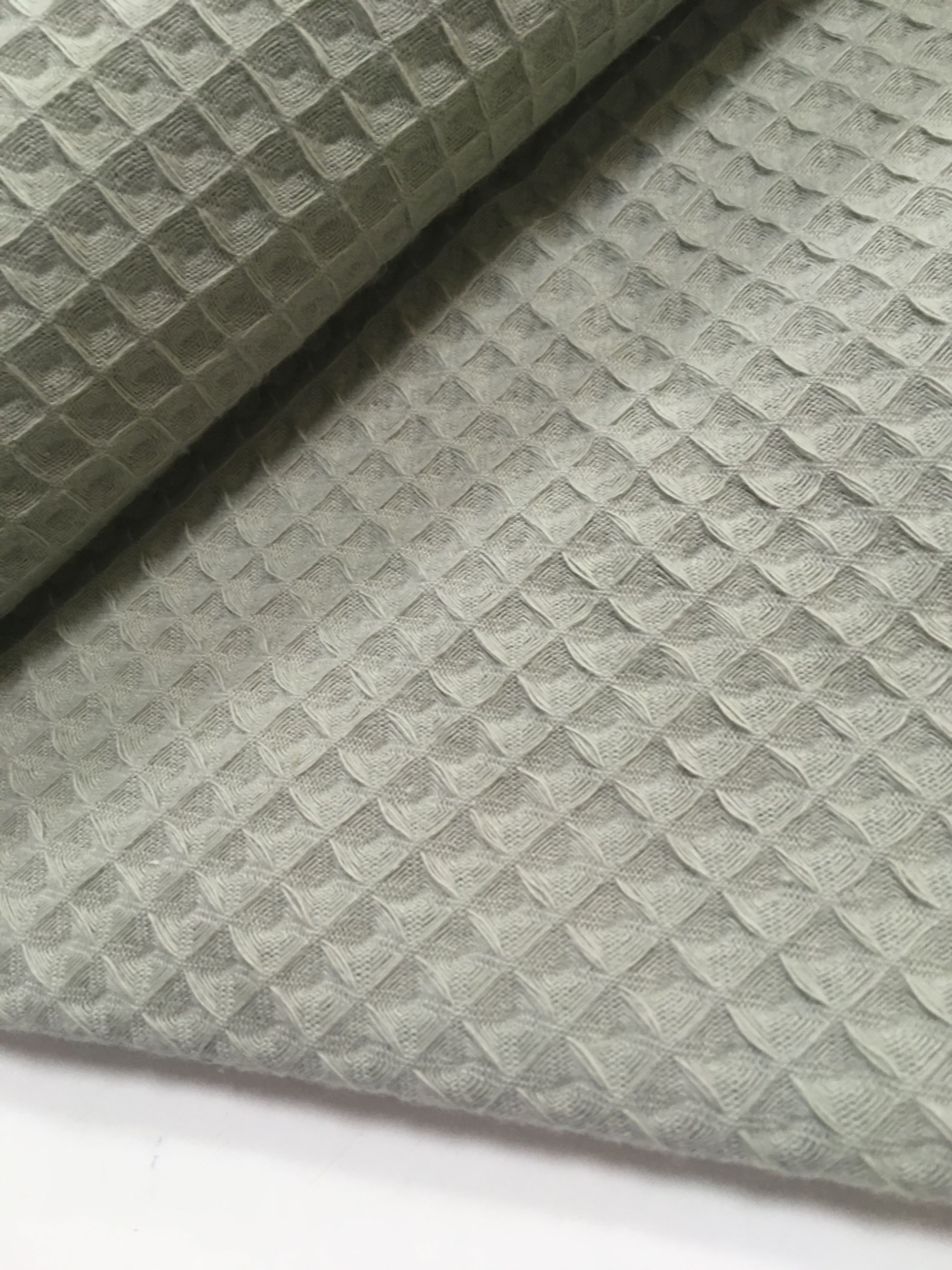 Waffle o gofre, es un tejido llamado así por sus cuadraditos en relieve haciendo forma de nido de abeja,es esponjosa con un tacto suave, manejable y cómoda muy útil para hacer prendas de bebé, sacos,arruyos etc.