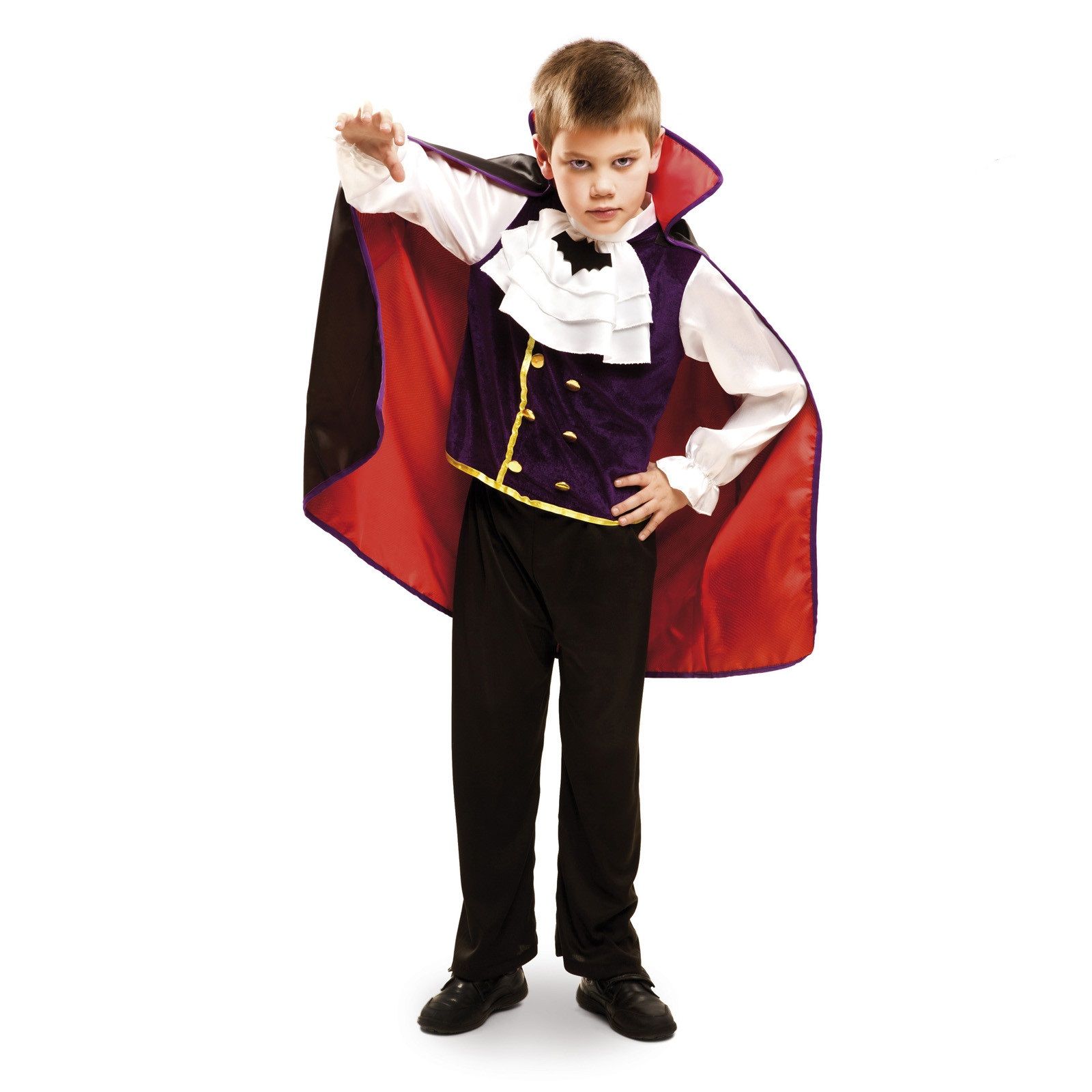 El disfraz de Vampiro para niño contiene Capa, chaleco con mangas, pantalones y chorrera