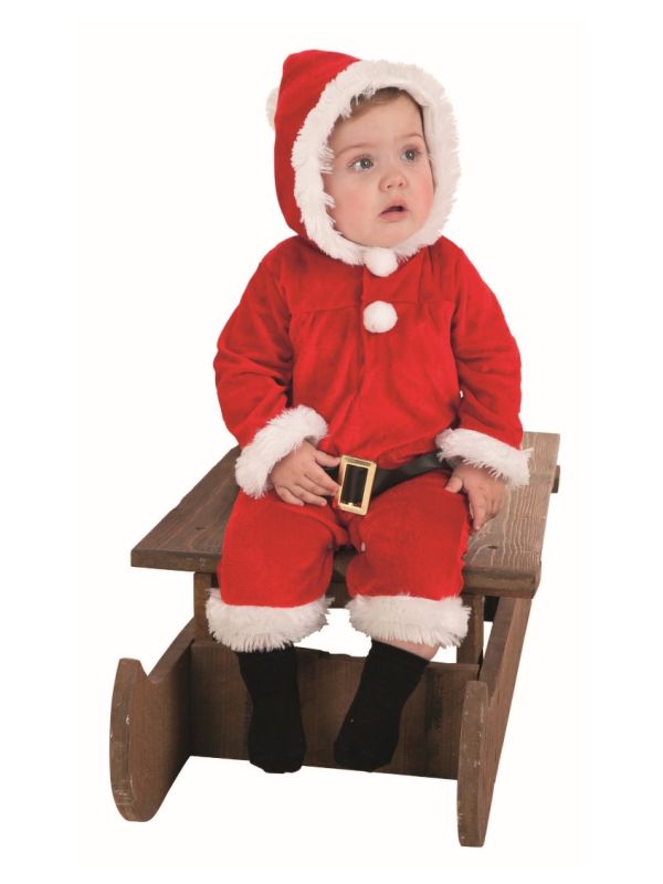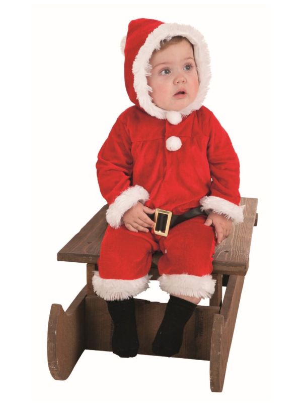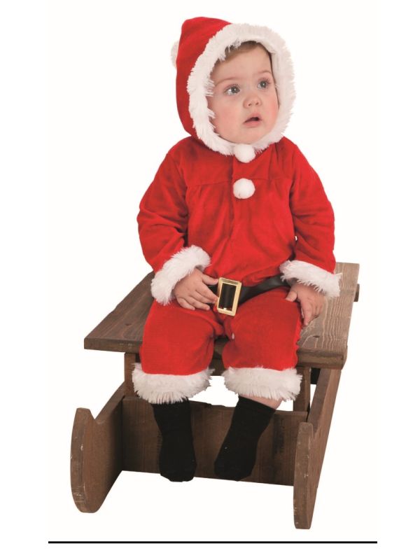 El disfraz de papa noel para bebe contiene mono con capucha. El mono tiene corchetes en la entrepierna para una mayor comodidad.