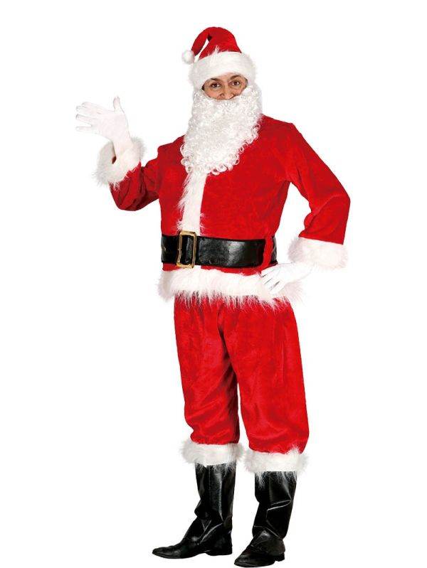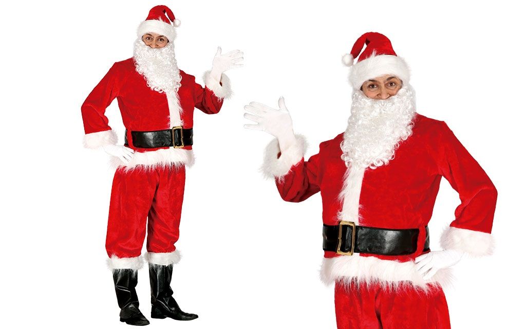 El traje de papa noel contiene gorro, barba, chaqueta, cinturón, guantes, pantalón y cubrebotas.