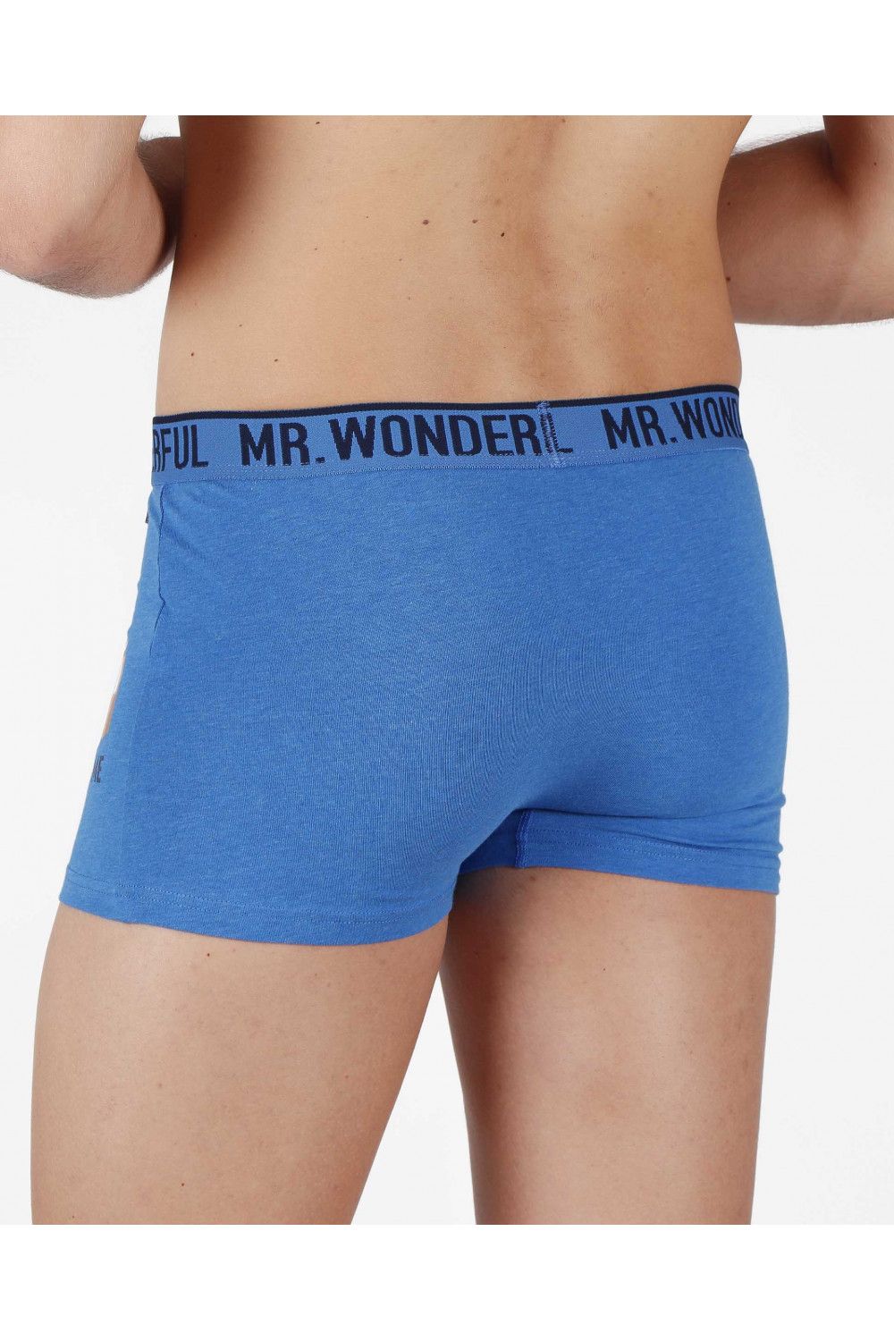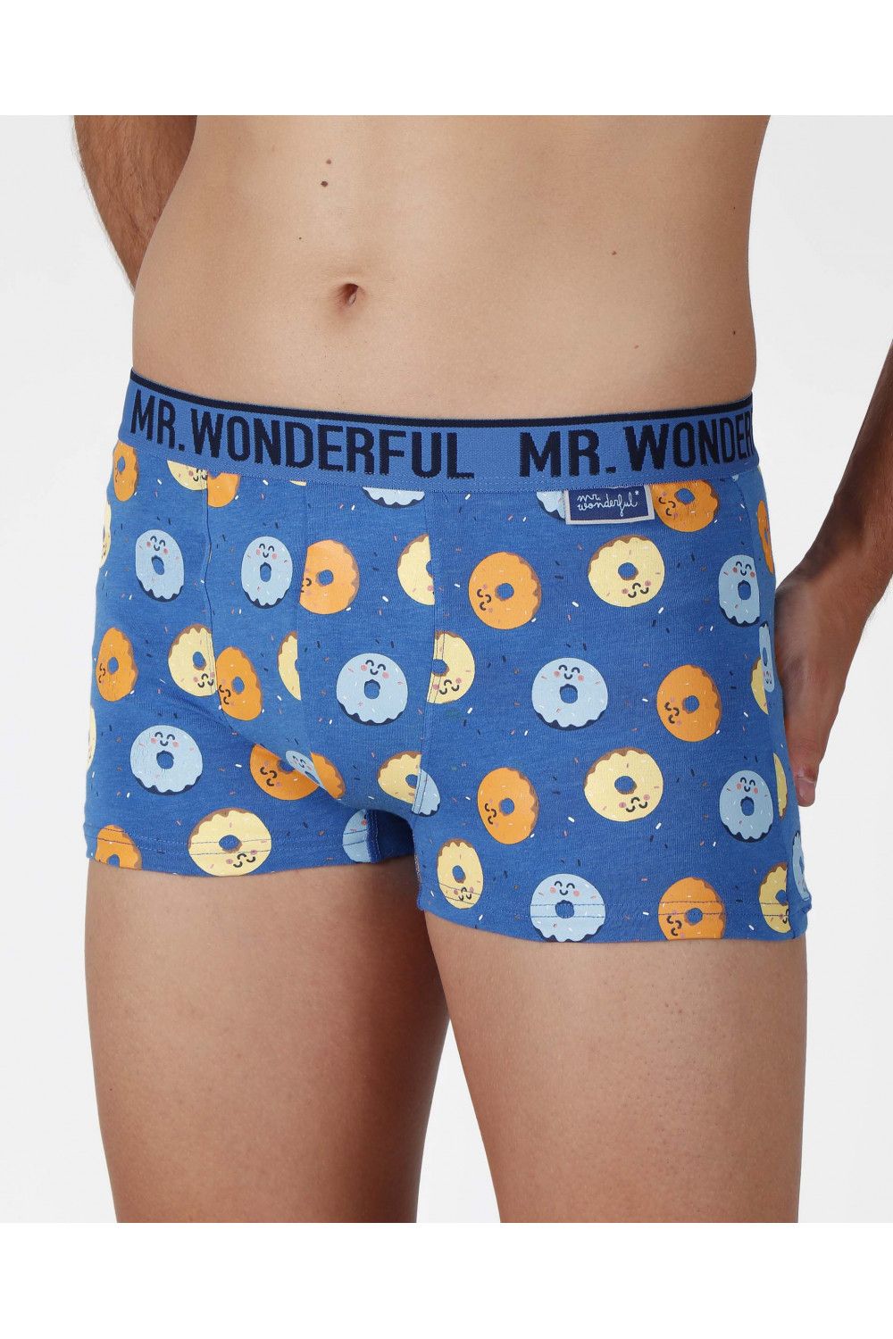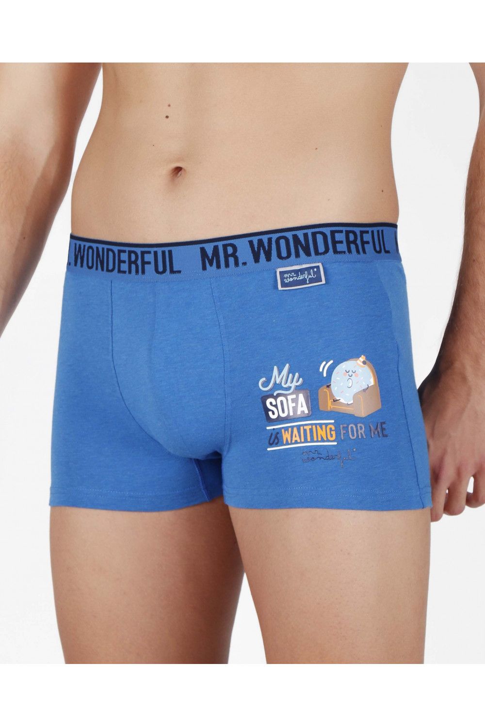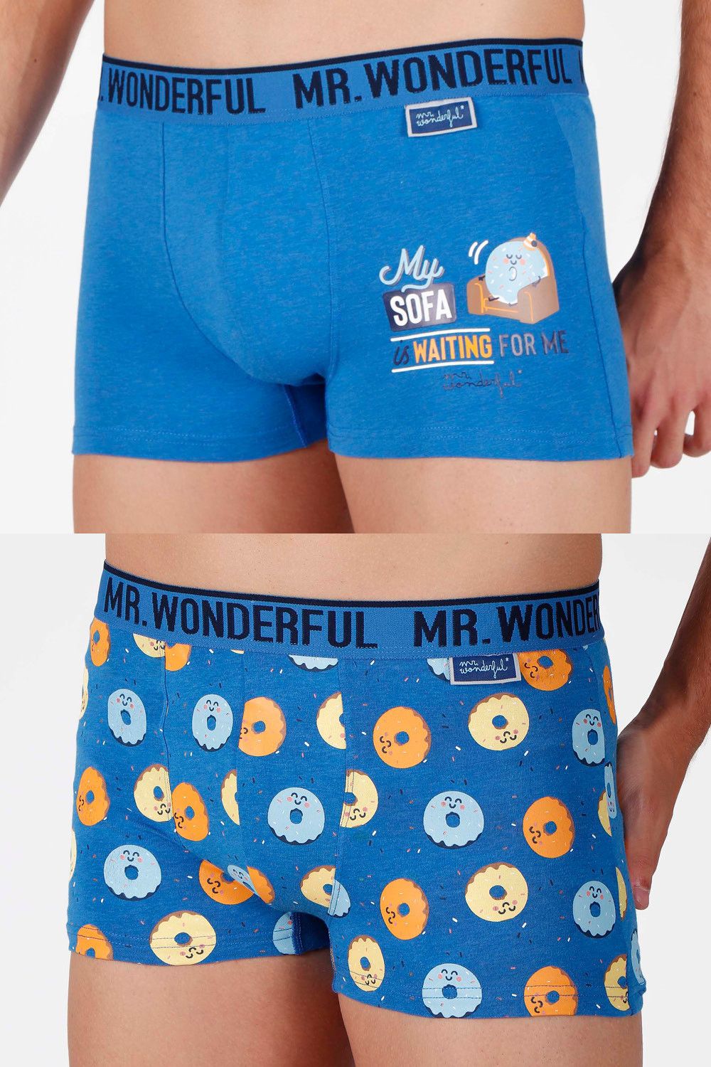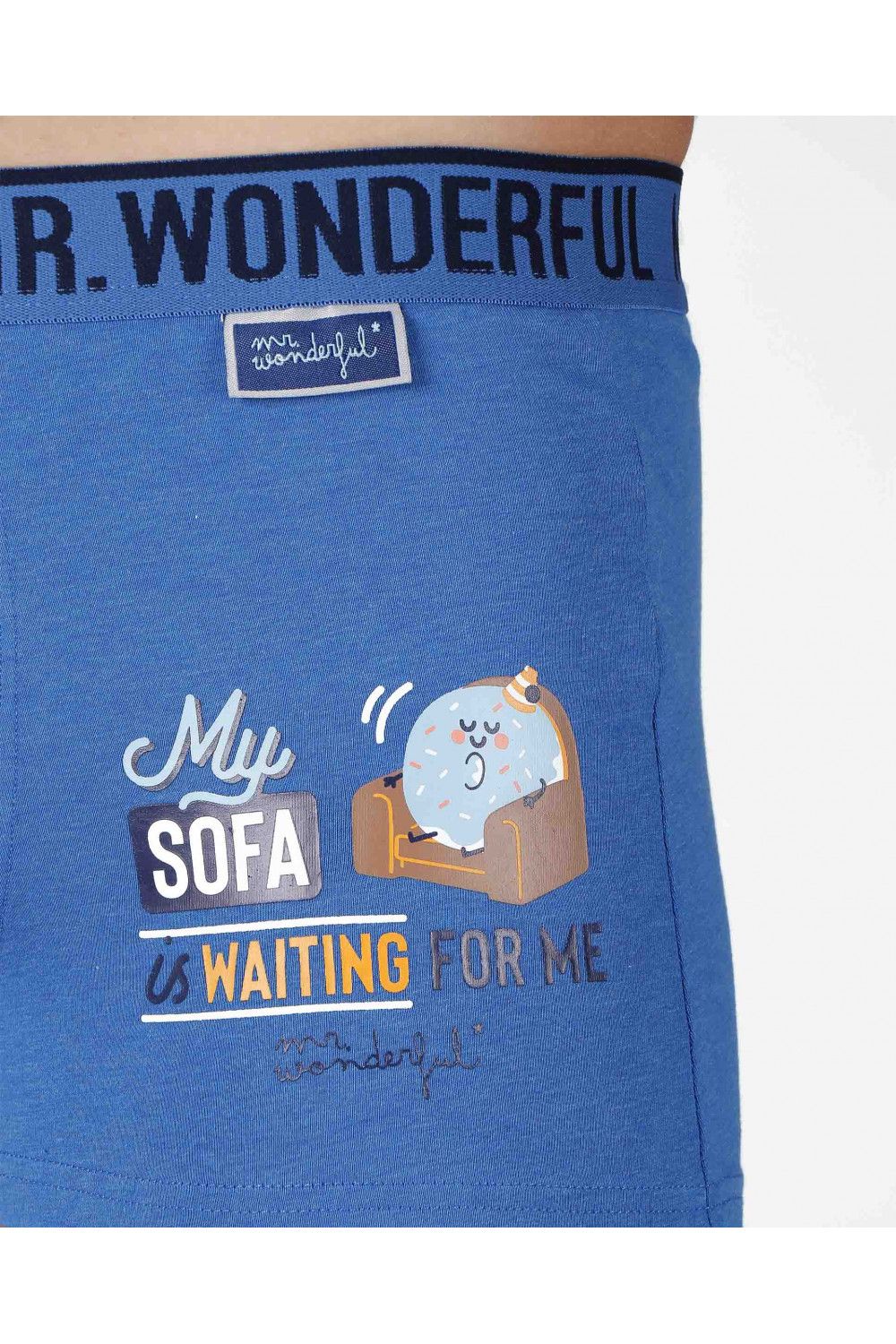 Pack de dos bóxer para hombre de algodón elástico, de color azul, en dos combinaciones de tejido: liso y estampado. el liso es en azul francia con detalle lateral de rosquilla sentada en el sofa y la frase "My sofa is waiting for me" y el estampado es de fondo azul con dibujos de rosquilla de colores. Goma elástica personalizada de la marca Mr Wonderful.Tejido suave al tacto.