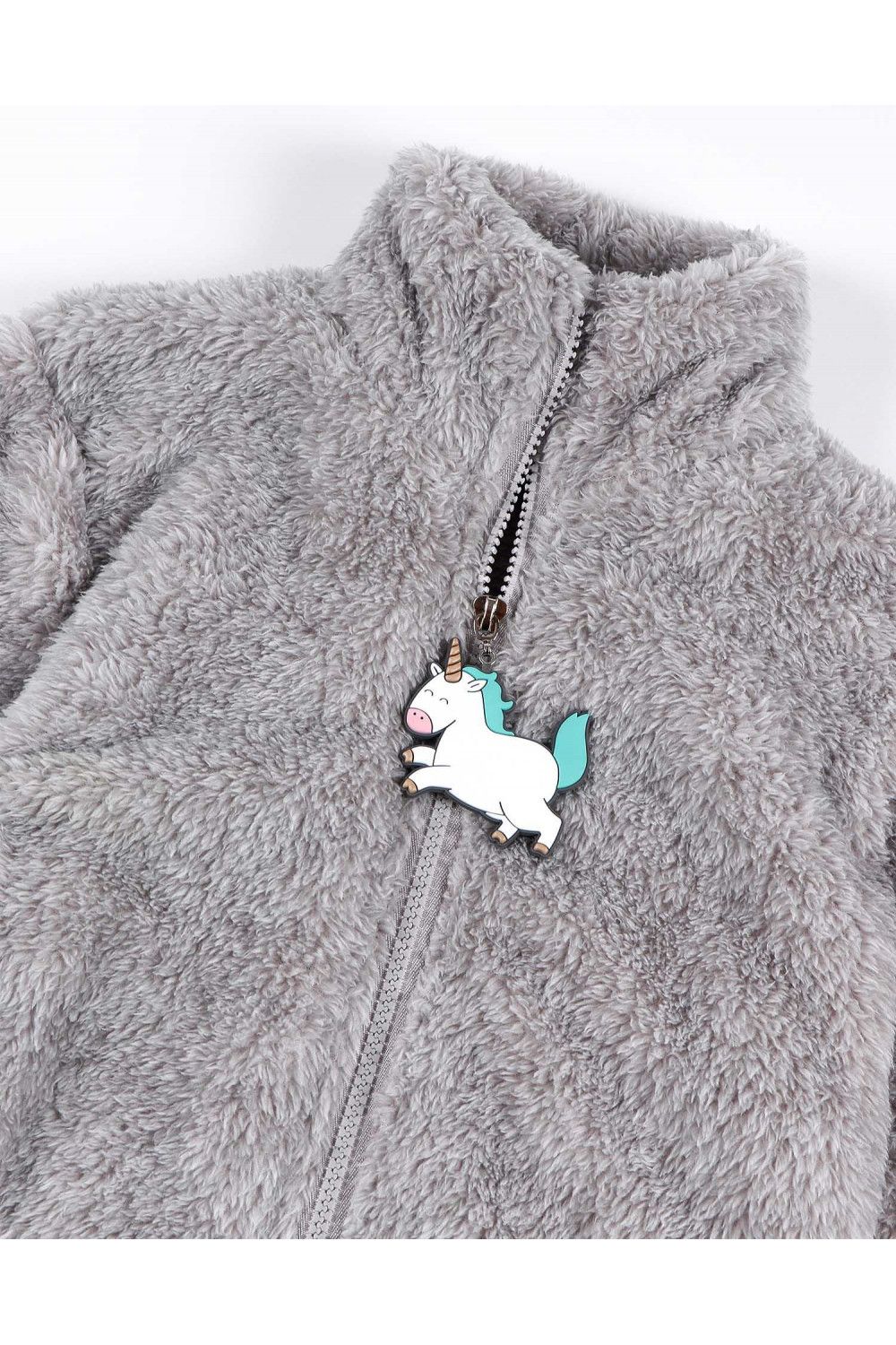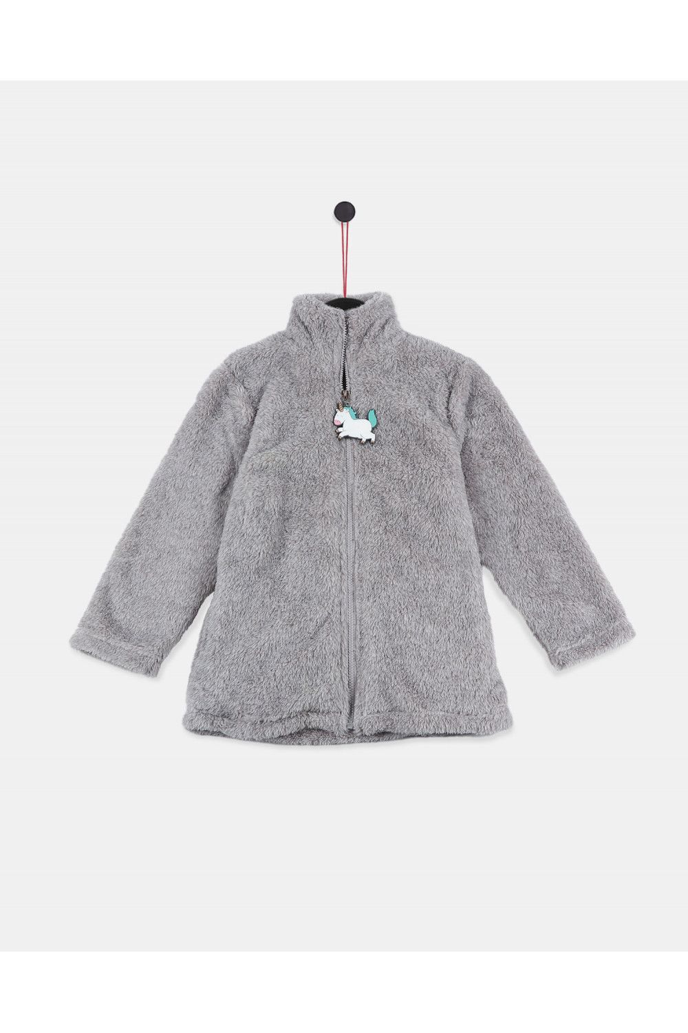 Bata niña en tejido especial Corel muy calentito, en color gris jaspe con bolsillos. En la espalda se encuentra el clásico unicornio Mr Wonderful con la frase ¨¨¨¨´"Para Fantástica Tú".Cuenta con cremallera y tirador personalizado de unicornio. Es la bata ideal para estar cómoda y muy calentita en los días más fríos de invierno. Tejido suave al tacto