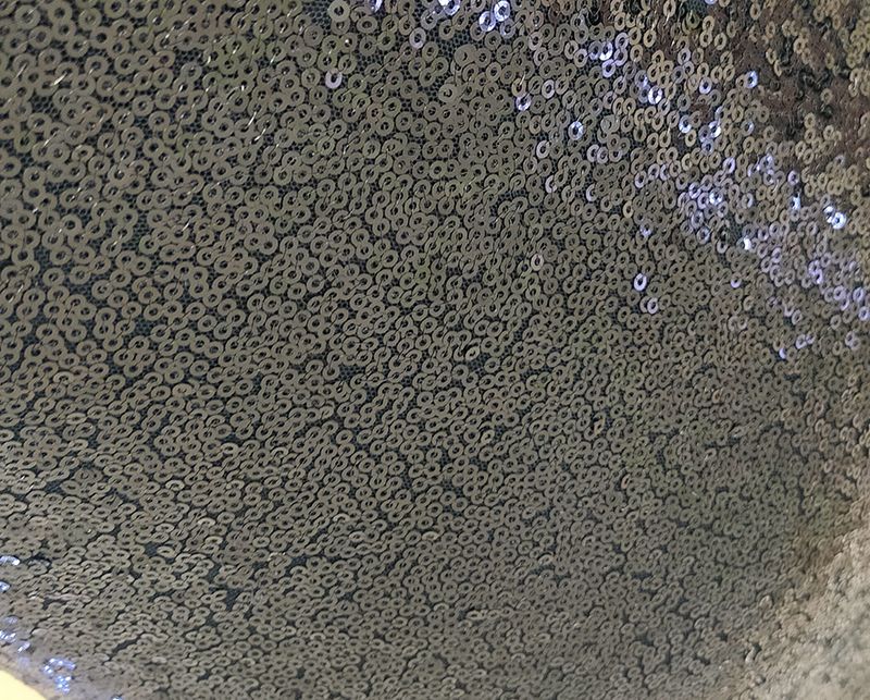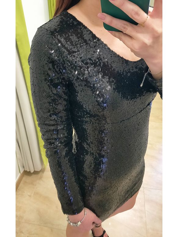 Vestido corto de lentejuelas negras con manga larga y escote pico.