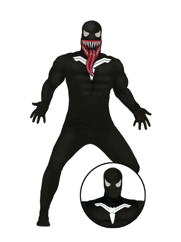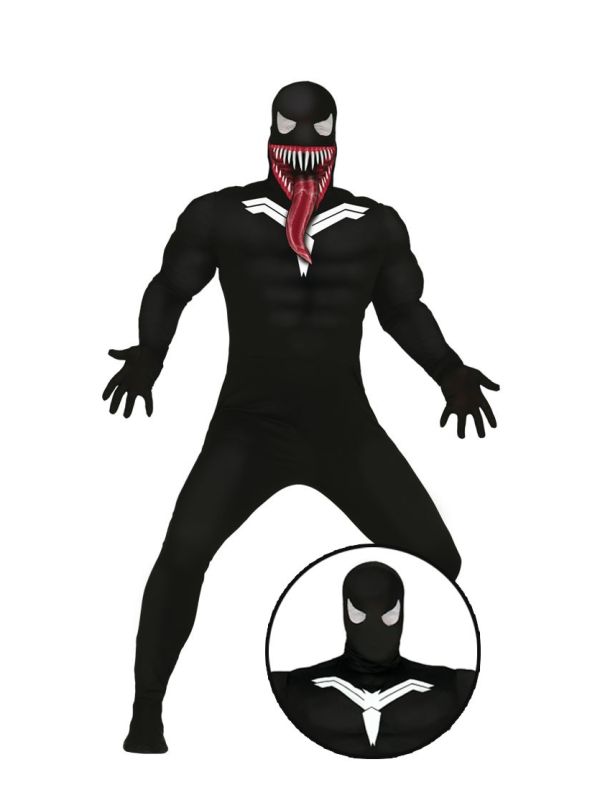 El disfraz de Venom contiene mono con músculos, capucha y boca
