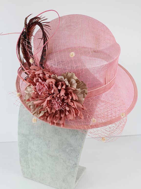 Sombrero tipo casquete, en color rosa palo decorado con plumas de faisán sintético y flores en tonos rosa palo y beige. Sutilmente tenemos una finisima red en los mismos tonos que se integra perfectamente en el tocado.