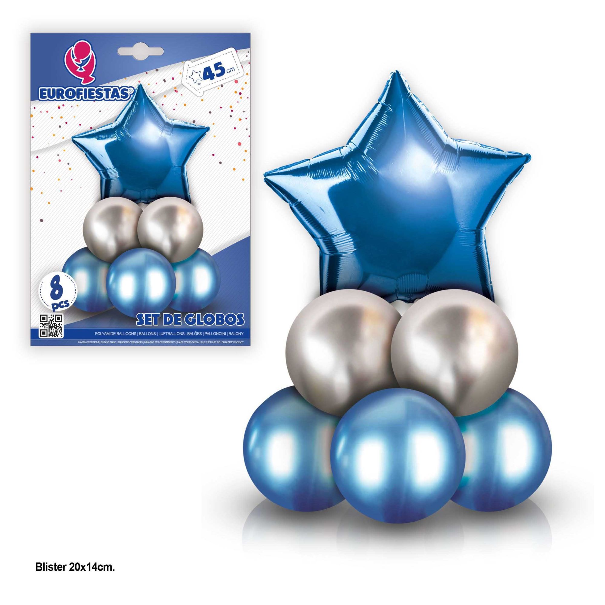 Contiene 8 globos. 4 azul cromo, 3 Plata cromo y una estrella azul de 45 cm