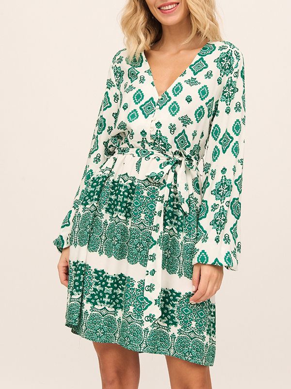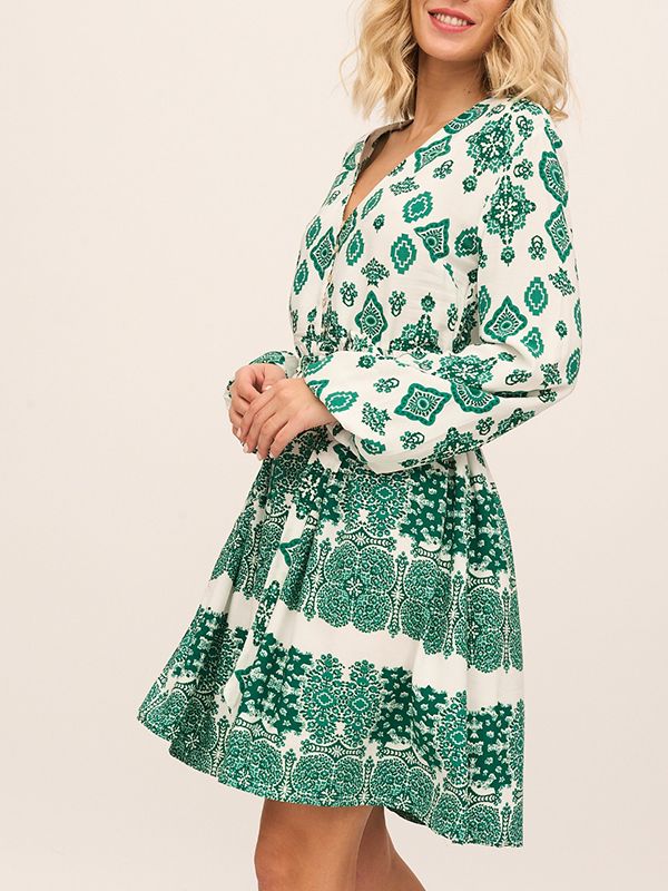 Vestido corto con estampado de flores tipo mandala, cuello pico con botones, bolsillos laterales, lazo en la misma tela y manga larga con puños con goma.