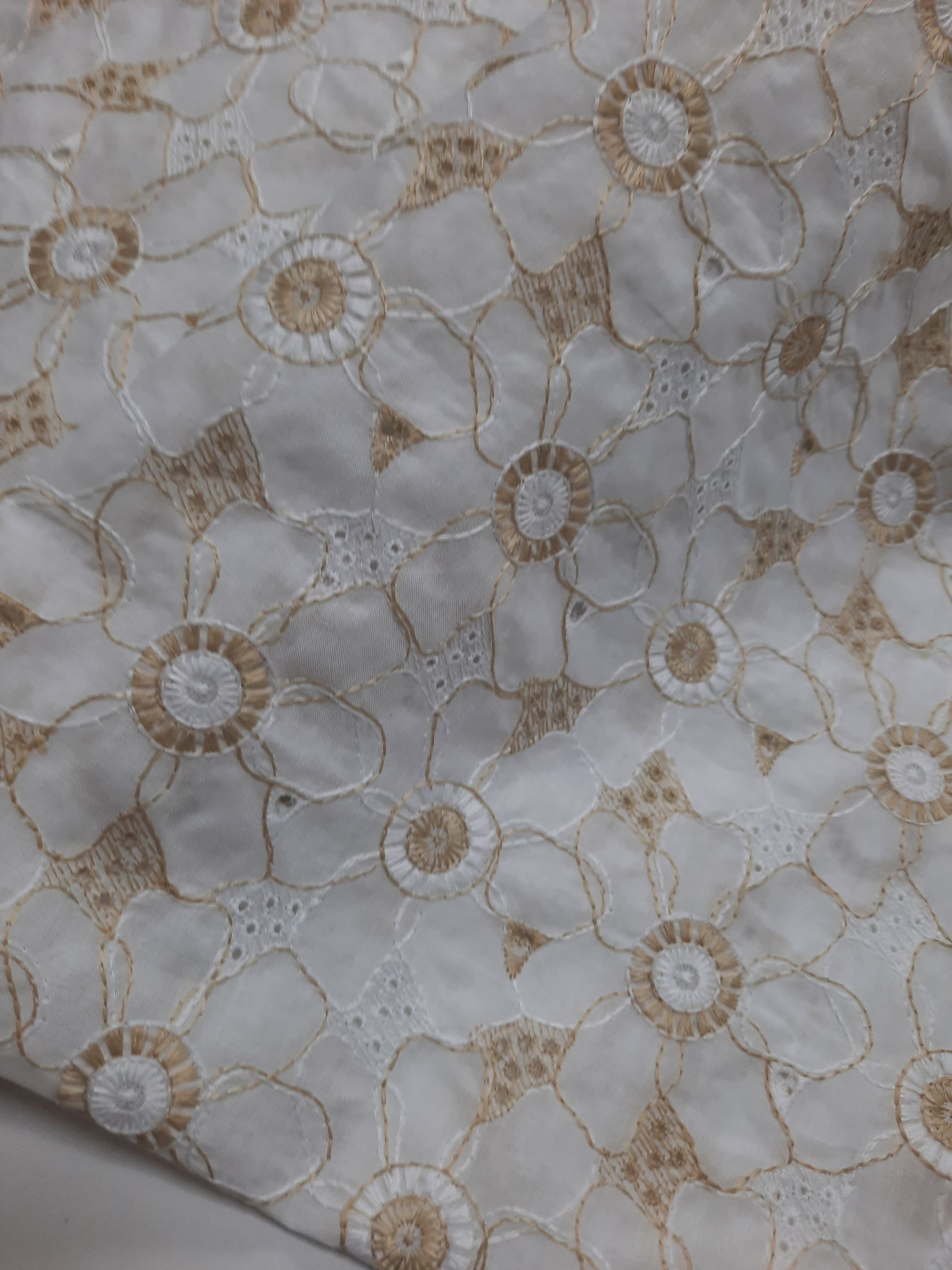 La batista bordada como su nombre bien define ,es un tejido de batista con bordados y perforado,pueden ser blancos o de color,en este caso blanco y estampación de colores ,vivos ,no estridentes y muy favorecedores.