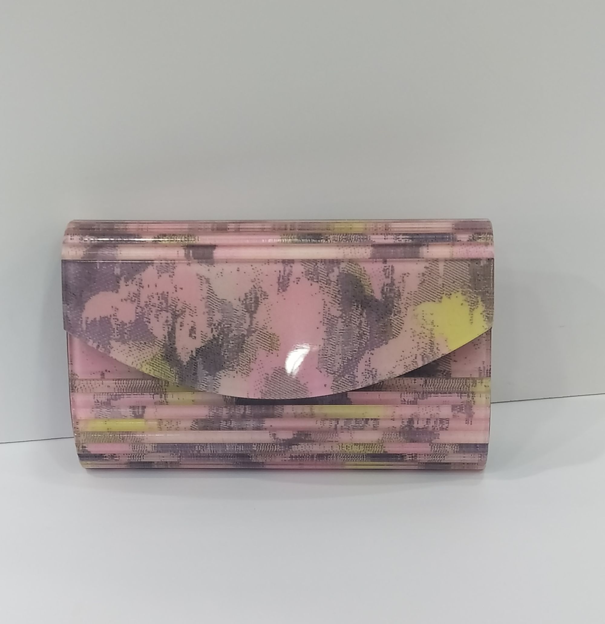 Bolso clutch de nacar con entornos de agua marina, tonos rosados con solapa y cadena dorada.