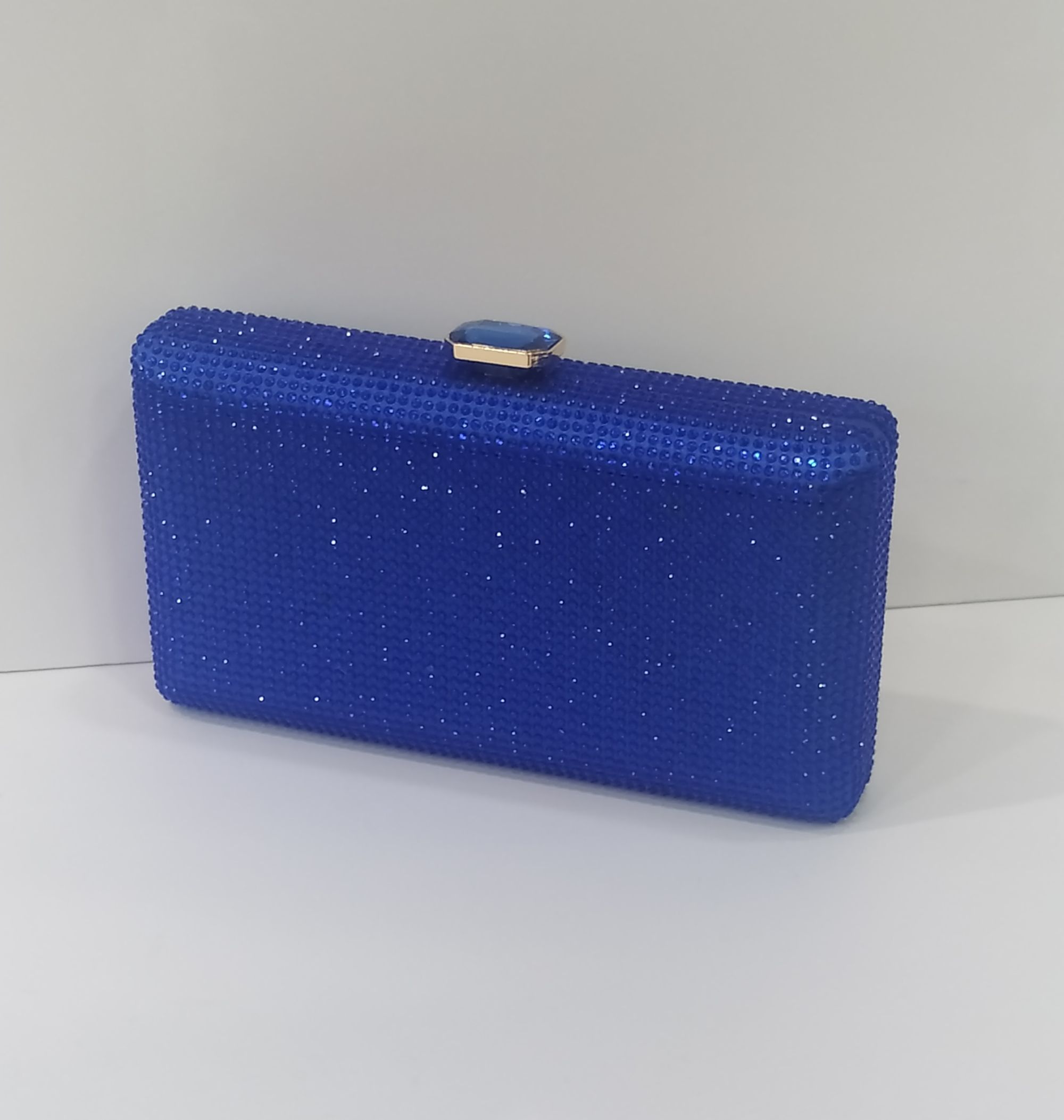 Bolso fiesta azulón rectángular con brillante por las dos caras, broche dorado y piedra azulona.