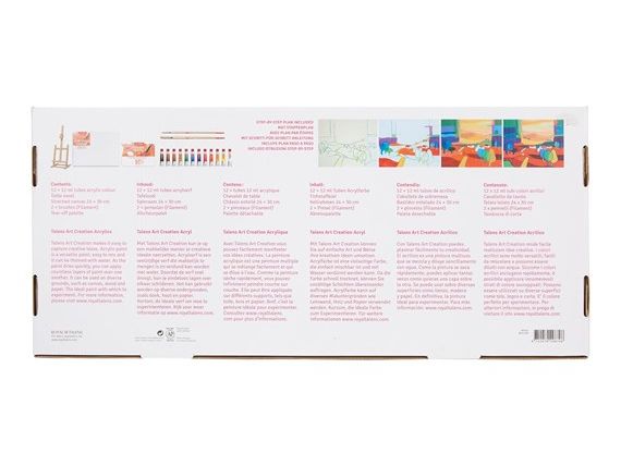 Contenido: 12 tubos de acrílico de 12 ml, un caballete de sobremesa, un bastidor entelado de 24x30 cm., 2 pinceles para acrílico y una paleta desechable.