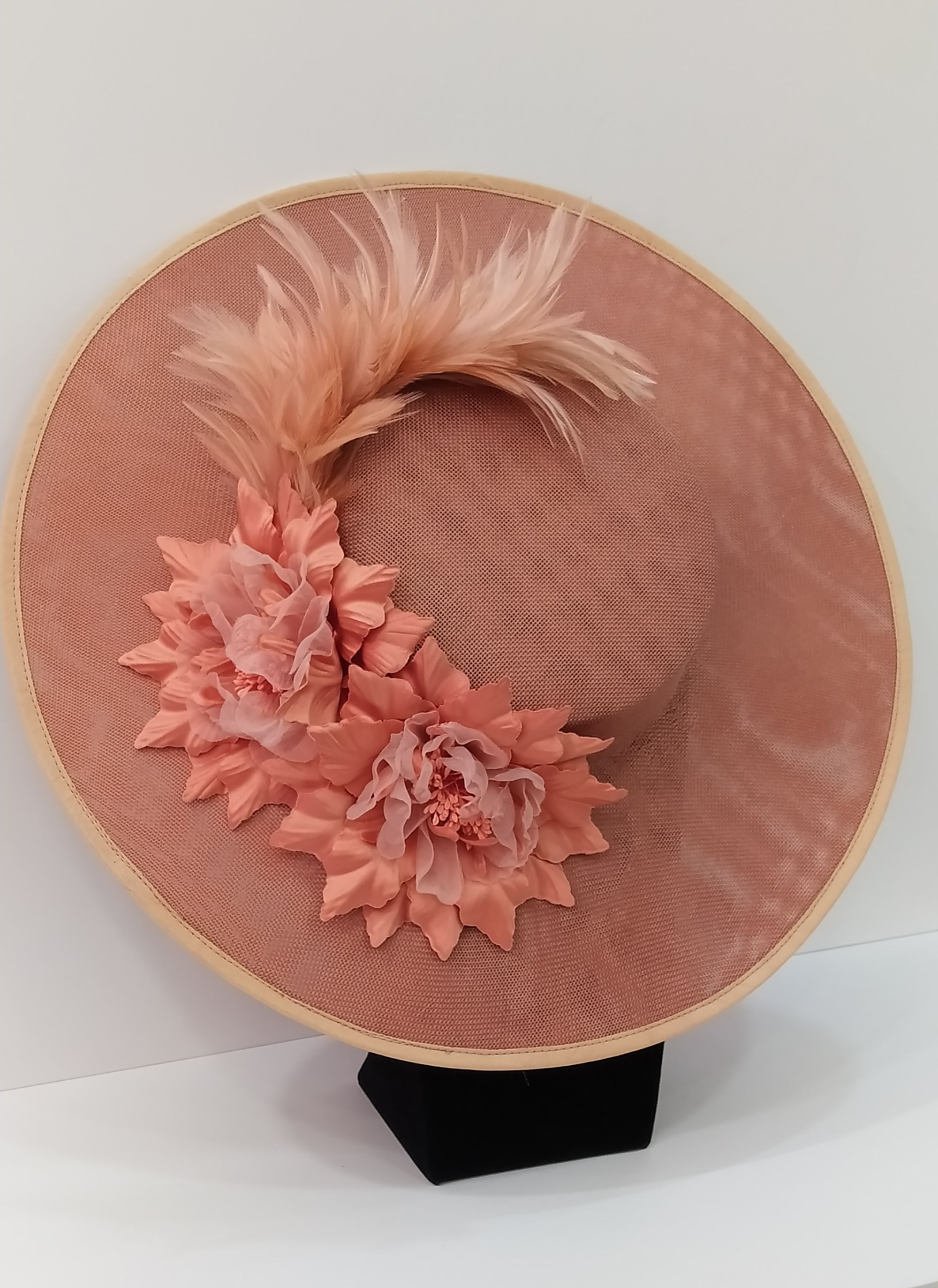 Pamela salmon con dos flores y unas plumas.