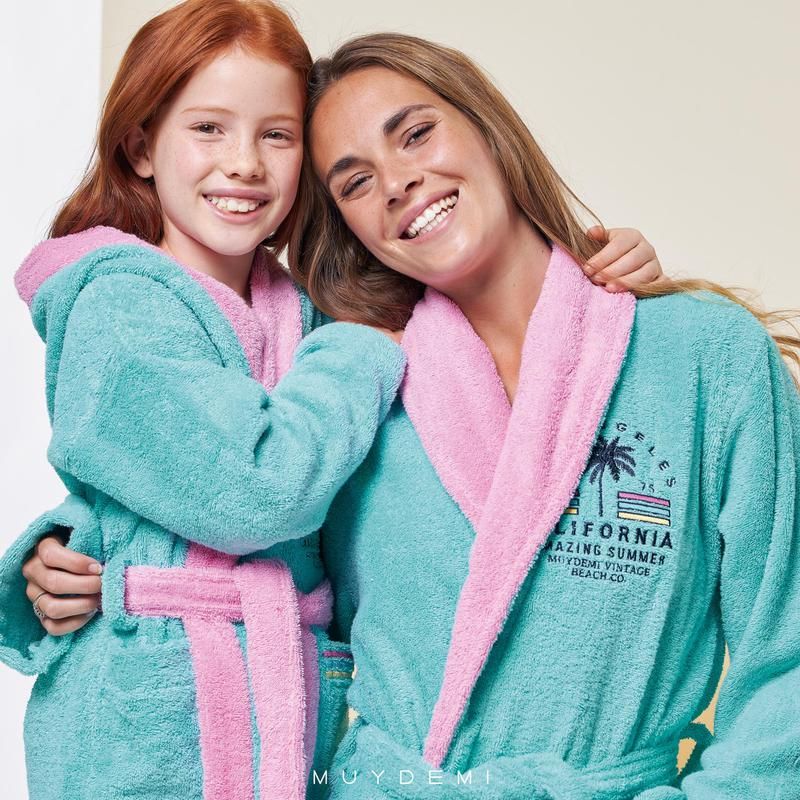 Albornoz de niña en fondo verde con capucha y ribete en rosa.Dibujo en la parte izquierda de modo decorativo. Cinturon en rosa.