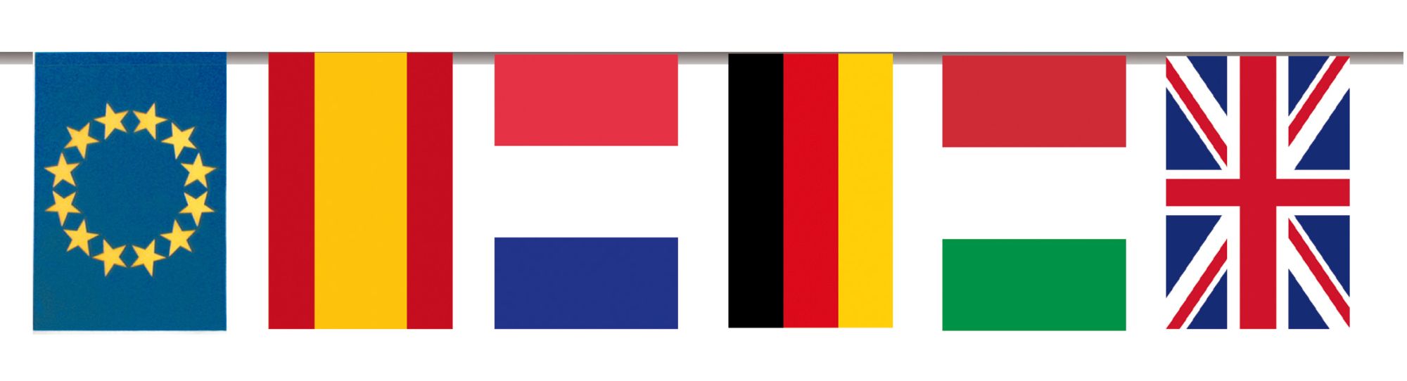 Tira de banderas de plastico de 50 metros de todos los paises. Las banderas estan cosidas a la tira de plástico para una mejor sujeccion y resistencia a las condiciones ambientales. Para decorar plazas, calles o locales para las fiestas.