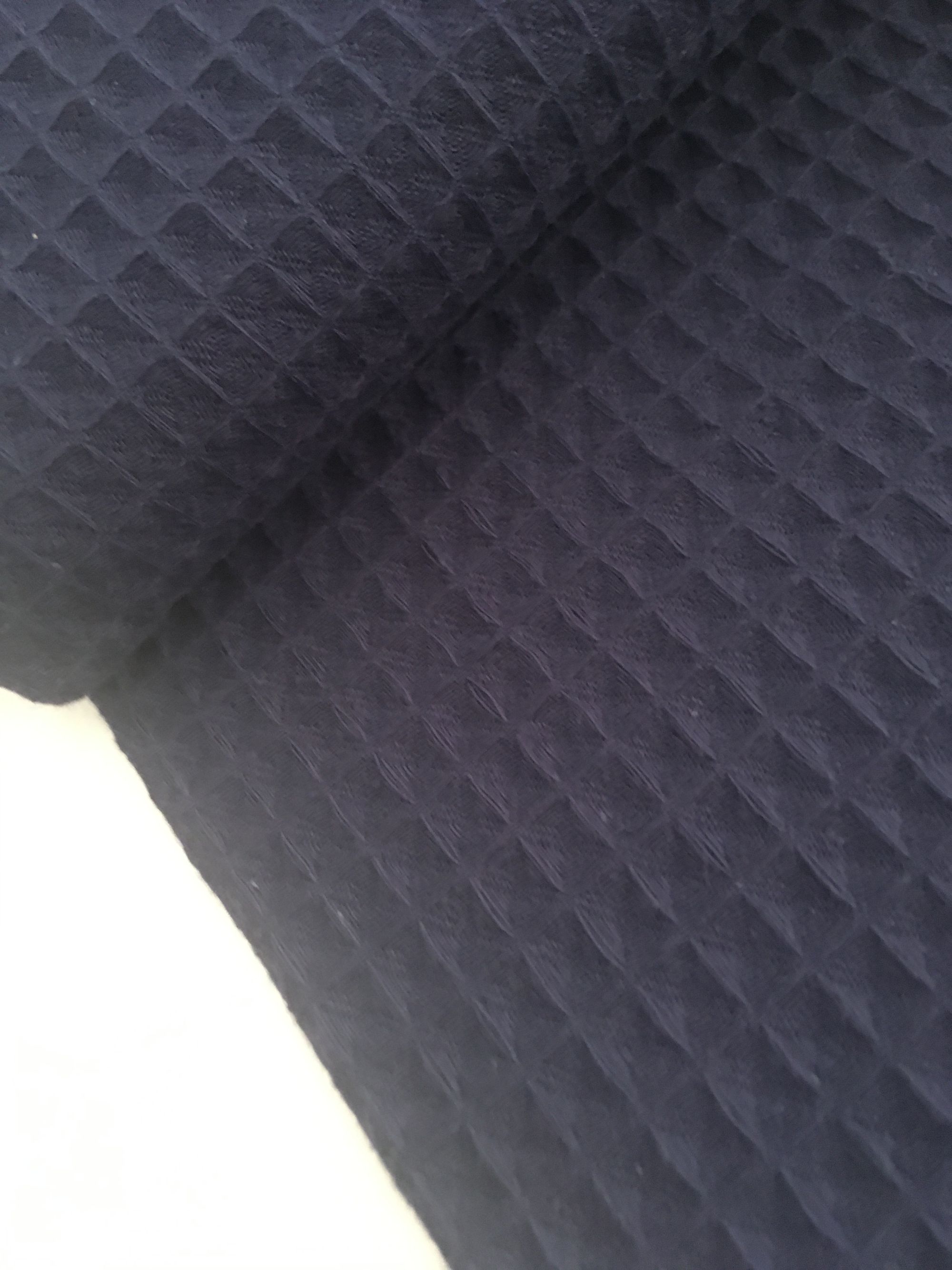 Waffle o gofre, es un tejido llamado así por sus cuadraditos en relieve haciendo  forma de nido de abeja,es esponjosa con un tacto suave, manejable y cómoda muy útil para hacer prendas de bebé, sacos,arruyos etc..... también puedes confeccionar acesorios para el hogar como paño de cocina, albornoz....