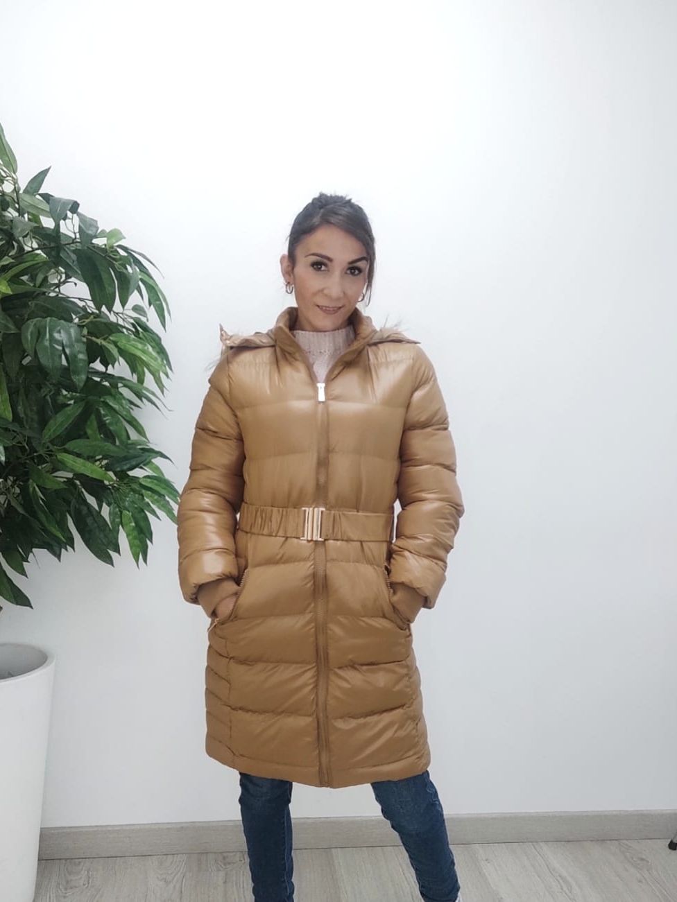 Plumífero guateado con capucha ribeteada en pelo sintético. Manga larga con puño exterior. Cinturón a juego con hebilla dorada. Bolsillos laterales en cremallera. Cierre frontal en cremallera.