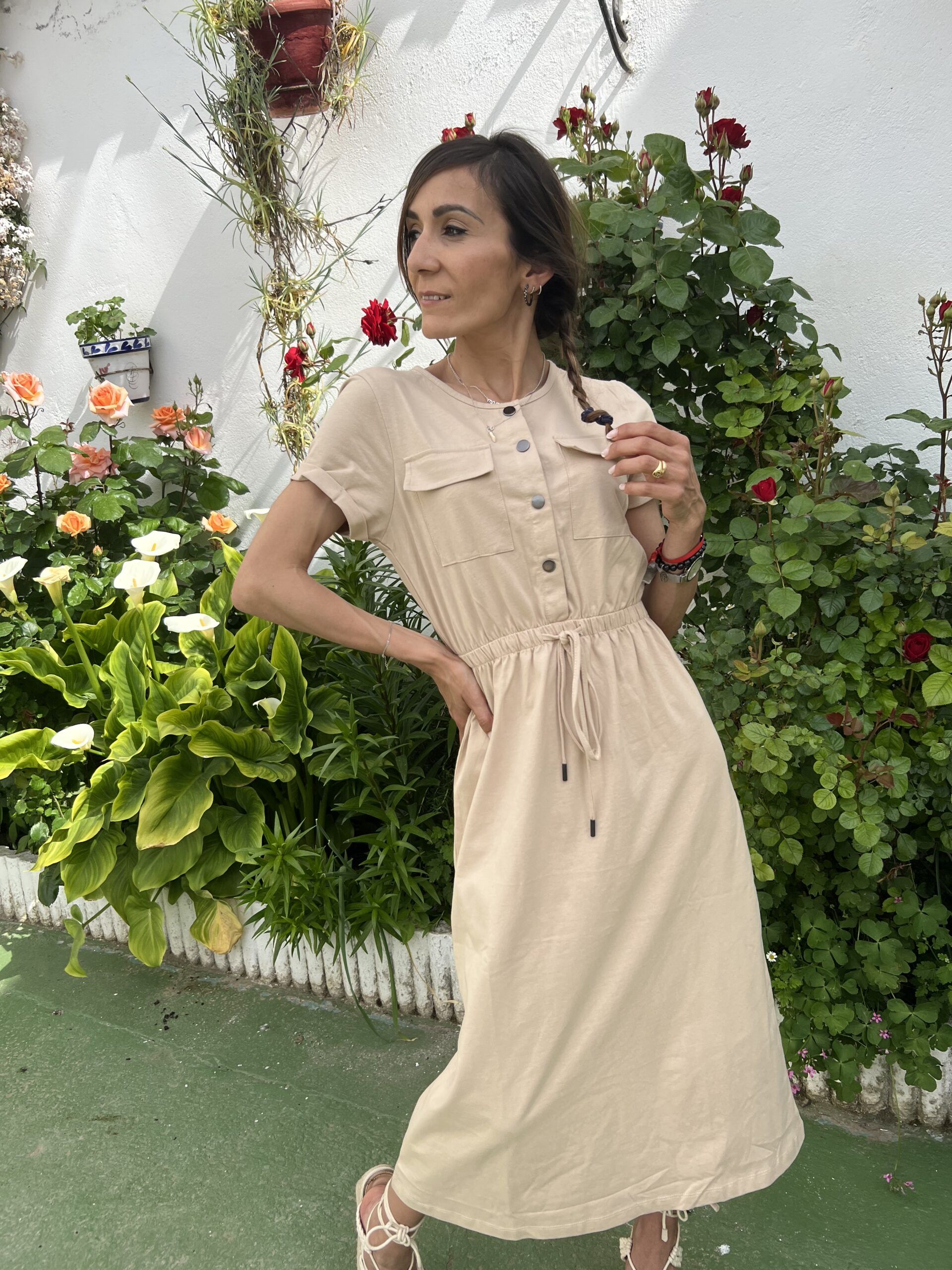 Vestido de punto de manga corta y cuello redondo. Cierre frontal en botón a presión. Cintura elastica ajustable con cordón. Bolsillos de plastón delanteros.