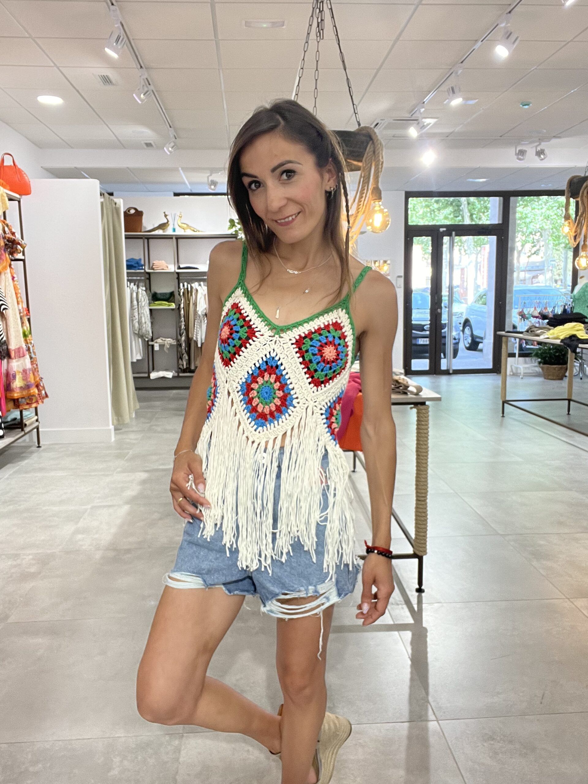 p style=text-align:leftTop multicolor con escote a pico en sisas y flecos en el bajo/p