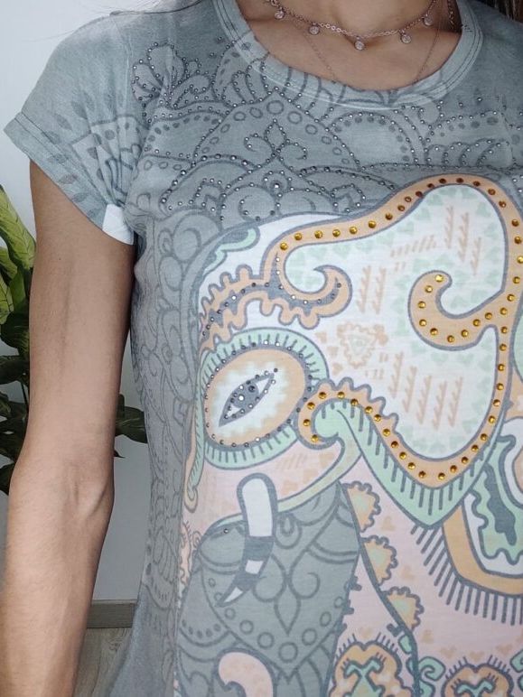 Camiseta de cuello caja. Manga corta con pedrería. Estampado elefante con pedrería. Parte trasera estampada.br / br / 60 % Poliéster.br / br / 35% Viscosa.br / br / 5% Lycra.