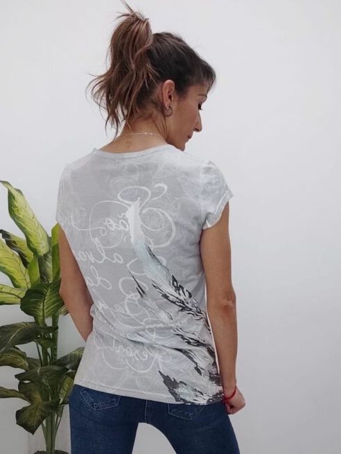 Camiseta de cuello caja en color gris claro. Manga corta . Estampado frontal de calavera y flores con pedrería. Parte trasera estampada.br / br / 60 % Poliéster.br / br / 35% Viscosa.br / br / 5% Lycra.
