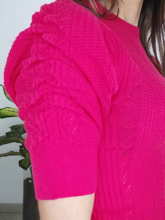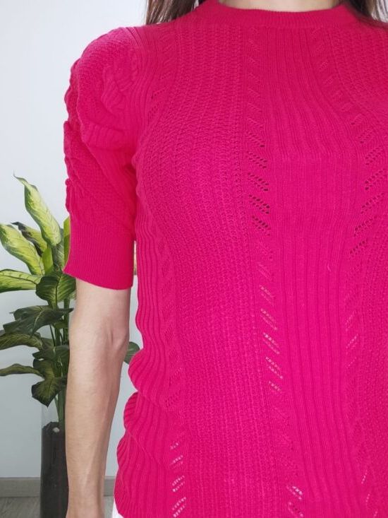 Jersey de algodón calado con cuello redondo. Manga corta abullonada con punto Pointelle. Entallado. Bajo en Rib.br / br / 100% Algodón.